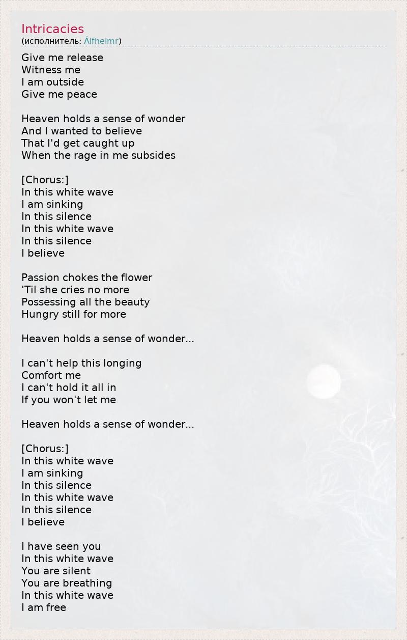 Give me release Witness me I am outside Give me peace Heaven holds a sense of wonder And I wanted to believe That I'd get caught up When the rage in me subsides [Chorus:] In this white wave I am sinking In this silence In this white wave In this silence I believe Passion chokes the flower 'Til she cries no more Possessing all the beauty Hungry still for more Heaven holds a sense of wonder... I can't help this longing Comfort me I can't hold it all in If you won't let me Heaven holds a sense of wonder... [Chorus:] In this white wave I am sinking In this silence In this white wave In this silence I believe I have seen you In this white wave You are silent You are breathing In this white wave I am free