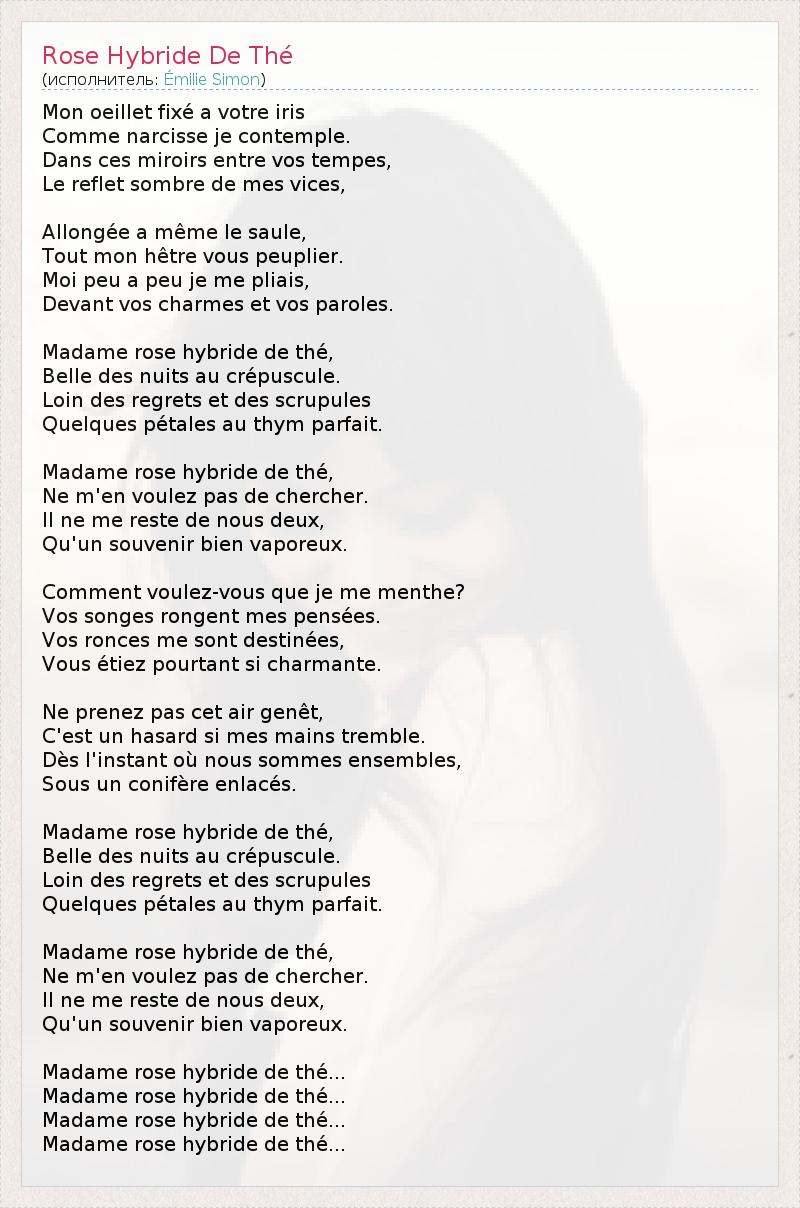 Мои глаза замерли на твоей радужной оболочке, Как нарцисс, я созерцаю. В этих зеркалах, между храмами, Тёмное отражение моих пороков. Растянувшись на иве, (Вы мои буки, твои тополя). (=Я буду для тебя популярной) 1. Постепенно я разверну их. Перед твоим шармом и словами. Леди чайно-розовый гибрид. Красивые ночи в сумерках. Вдали от сожаления и угрызений совести В нескольких идеальных (лепестках тимьяна). (=чертах лица) Леди чайно-розовый гибрид, Я не хочу искать. У нас на двоих, Только очень плохая память. Хочешь, чтобы я (мята)? (=лгала) Твои мечты разъедают мои мысли. Твои шипы предназначены мне, Тем не менее, ты был таким очаровательным. Не смотри (метлой), (=смущённо) Так получилось, что руки дрожат. С тех пор мы вместе, Сплетённые, (под хвойными породами). (=воедино) Леди чайно-розовый гибрид. Красивые ночи в сумерках. Вдали от сожаления и угрызений совести В нескольких идеальных (лепестках тимьяна). (=чертах лица) Леди чайно-розовый гибрид, Я не хочу искать. У нас на двоих, Только очень плохая память. Леди чайно-розовый гибрид... Леди чайно-розовый гибрид... Леди чайно-розовый гибрид... Леди чайно-розовый гибрид... 1 - В этой песне идиоматически обыграны французские слова и словосочетания. При убирании или добавлении одной или нескольких букв, изначальный бредовый текст превращается в более-менее логически верный. Пример: hêtre vous peuplier – бук, ты тополь/être vous populaire – быть для тебя знаменитой. Словосочетания звучат одинаково, но различны по написанию.