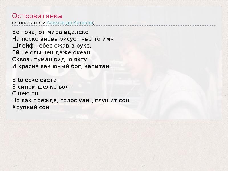 Вот она, от мира вдалеке На песке вновь рисует чье-то имя Шлейф небес сжав в руке. Ей не слышен даже океан Сквозь туман видно яхту И красив как юный бог, капитан. В блеске света В синем шелке волн С нею он Но как прежде, голос улиц глушит сон Хрупкий сон