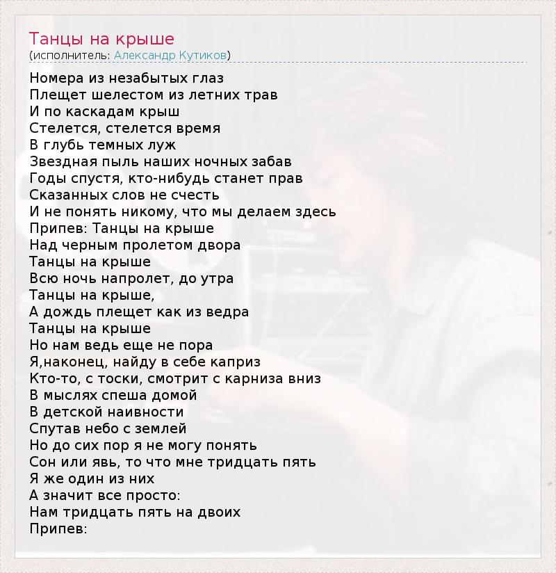 Номера из незабытых глаз Плещет шелестом из летних трав И по каскадам крыш Стелется, стелется время В глубь темных луж Звездная пыль наших ночных забав Годы спустя, кто-нибудь станет прав Сказанных слов не счесть И не понять никому, что мы делаем здесь Припев: Танцы на крыше Над черным пролетом двора Танцы на крыше Всю ночь напролет, до утра Танцы на крыше, А дождь плещет как из ведра Танцы на крыше Но нам ведь еще не пора Я,наконец, найду в себе каприз Кто-то, с тоски, смотрит с карниза вниз В мыслях спеша домой В детской наивности Спутав небо с землей Но до сих пор я не могу понять Сон или явь, то что мне тридцать пять Я же один из них А значит все просто: Нам тридцать пять на двоих Припев:
