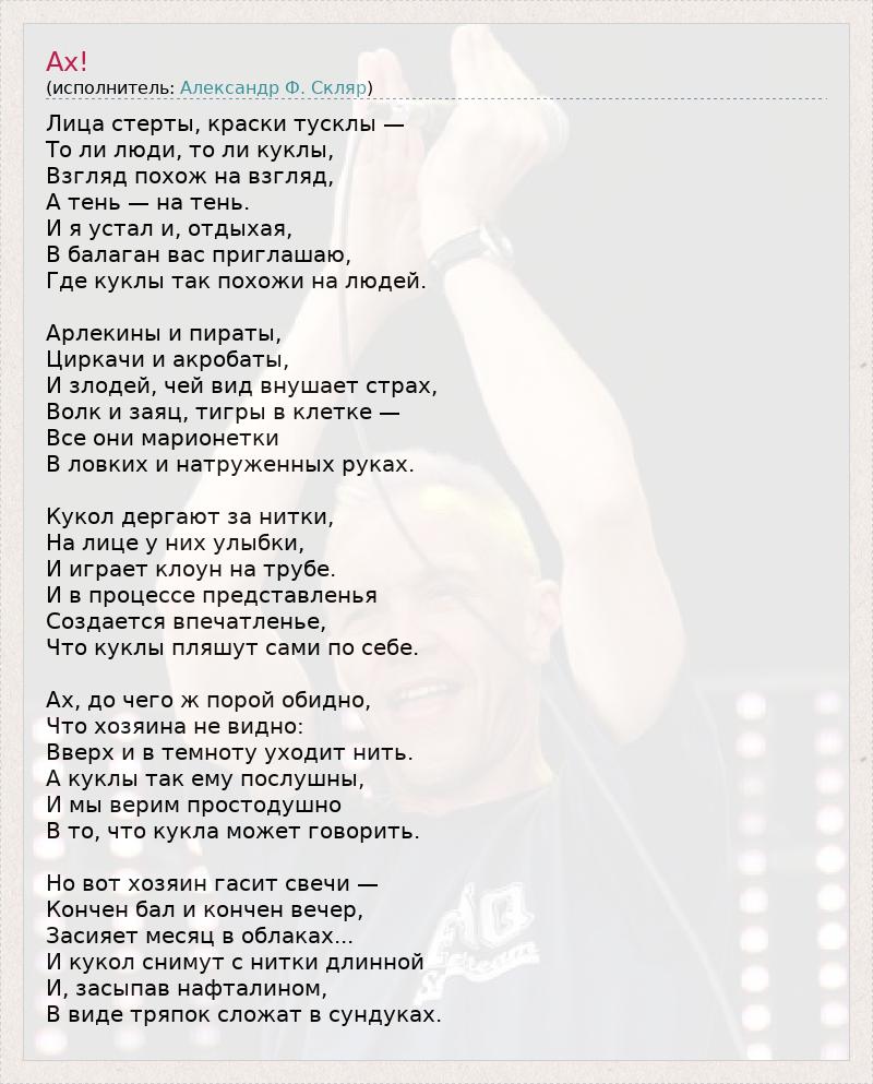 Это интересно:Александр Феликсович Скляр родился 7 марта 1958 года в Москве. Музыкант, автор песен, радиоведущий, актёр. Музыкальную карьеру начинал гитаристом групп Василия Шумова «777» и «Центр». Затем, в 1986-м году, создал собственный проект «Ва-Банкъ». В середине 1990-х параллельно начал сольную карьеру. Долгие годы он возглавлял движение «Учитесь плавать», пропагандирующее здоровый образ жизни, и вел... продолжение