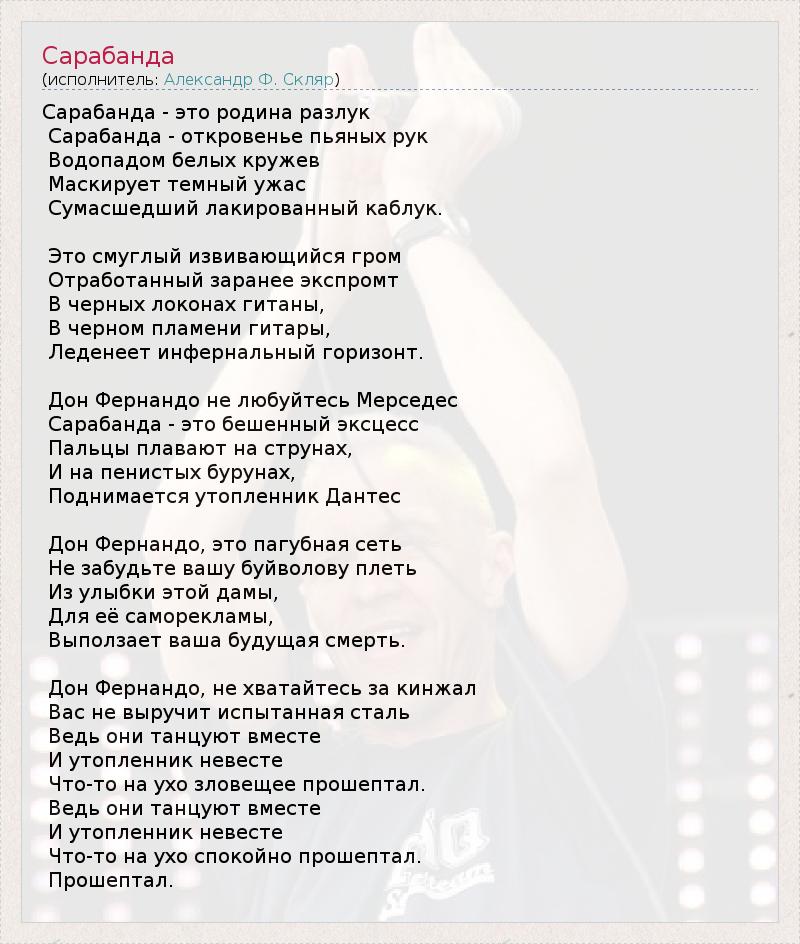 Сарабанда - это родина разлук Сарабанда - откровенье пьяных рук Водопадом белых кружев Маскирует темный ужас Сумасшедший лакированный каблук. Это смуглый извивающийся гром Отработанный заранее экспромт В черных локонах гитаны, В черном пламени гитары, Леденеет инфернальный горизонт. Дон Фернандо не любуйтесь Мерседес Сарабанда - это бешенный эксцесс Пальцы плавают на струнах, И на пенистых бурунах, Поднимается утопленник Дантес Дон Фернандо, это пагубная сеть Не забудьте вашу буйволову плеть Из улыбки этой дамы, Для её саморекламы, Выползает ваша будущая смерть. Дон Фернандо, не хватайтесь за кинжал Вас не выручит испытанная сталь Ведь они танцуют вместе И утопленник невесте Что-то на ухо зловещее прошептал. Ведь они танцуют вместе И утопленник невесте Что-то на ухо спокойно прошептал. Прошептал.