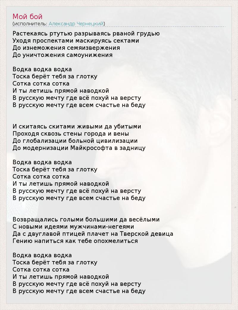 Растекаясь ртутью разрываясь рваной грудью Уходя проспектами маскируясь сектами До изнеможения семяизвержения До уничтожения самоунижения Водка водка водка Тоска берёт тебя за глотку Сотка сотка сотка И ты летишь прямой наводкой В русскую мечту где всё похуй на версту В русскую мечту где всем счастье на беду И скитаясь скитами живыми да убитыми Проходя сквозь стены города и вены До глобализации больной цивилизации До модернизации Майкрософта в задницу Водка водка водка Тоска берёт тебя за глотку Сотка сотка сотка И ты летишь прямой наводкой В русскую мечту где всё похуй на версту В русскую мечту где всем счастье на беду Возвращались голыми большими да весёлыми С новыми идеями мужчинами-негеями Да с двуглавой птицей плачет на Тверской девица Гению напиться как тебе опохмелиться Водка водка водка Тоска берёт тебя за глотку Сотка сотка сотка И ты летишь прямой наводкой В русскую мечту где всё похуй на версту В русскую мечту где всем счастье на беду
