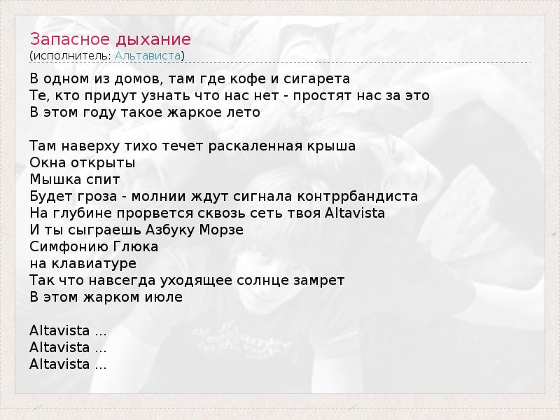В одном из домов, там где кофе и сигарета Те, кто придут узнать что нас нет - простят нас за это В этом году такое жаркое лето Там наверху тихо течет раскаленная крыша Окна открыты Мышка спит Будет гроза - молнии ждут сигнала контррбандиста На глубине прорвется сквозь сеть твоя Altavista И ты сыграешь Азбуку Морзе Симфонию Глюка на клавиатуре Так что навсегда уходящее солнце замрет В этом жарком июле Altavista ... Altavista ... Altavista ...