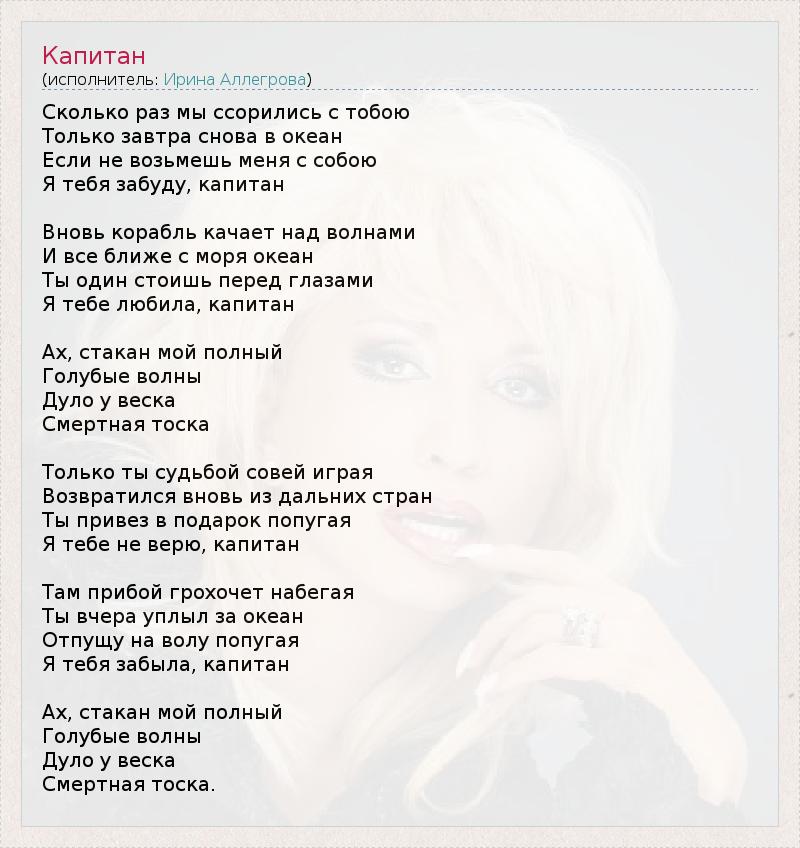 Это интересно:Аллегрова Ирина АлександровнаРодилась в Ростове-на-Дону 20 января.Выросла в актерской семье.После переезда семьи из Ростова-на Дону в Баку, Ирина Аллегрова получила музыкальное образование в Центральной Музыкальной Школе при Бакинской Консерватории (специальность - пианист-концертмейстер).Творческая карьера началась в Театре песни Рашида Бейбутова, народного артиста... продолжение