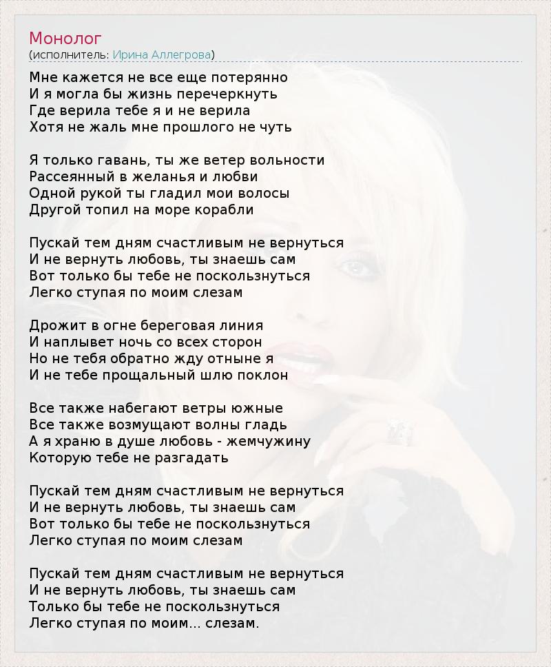 Это интересно:Аллегрова Ирина АлександровнаРодилась в Ростове-на-Дону 20 января.Выросла в актерской семье.После переезда семьи из Ростова-на Дону в Баку, Ирина Аллегрова получила музыкальное образование в Центральной Музыкальной Школе при Бакинской Консерватории (специальность - пианист-концертмейстер).Творческая карьера началась в Театре песни Рашида Бейбутова, народного артиста... продолжение