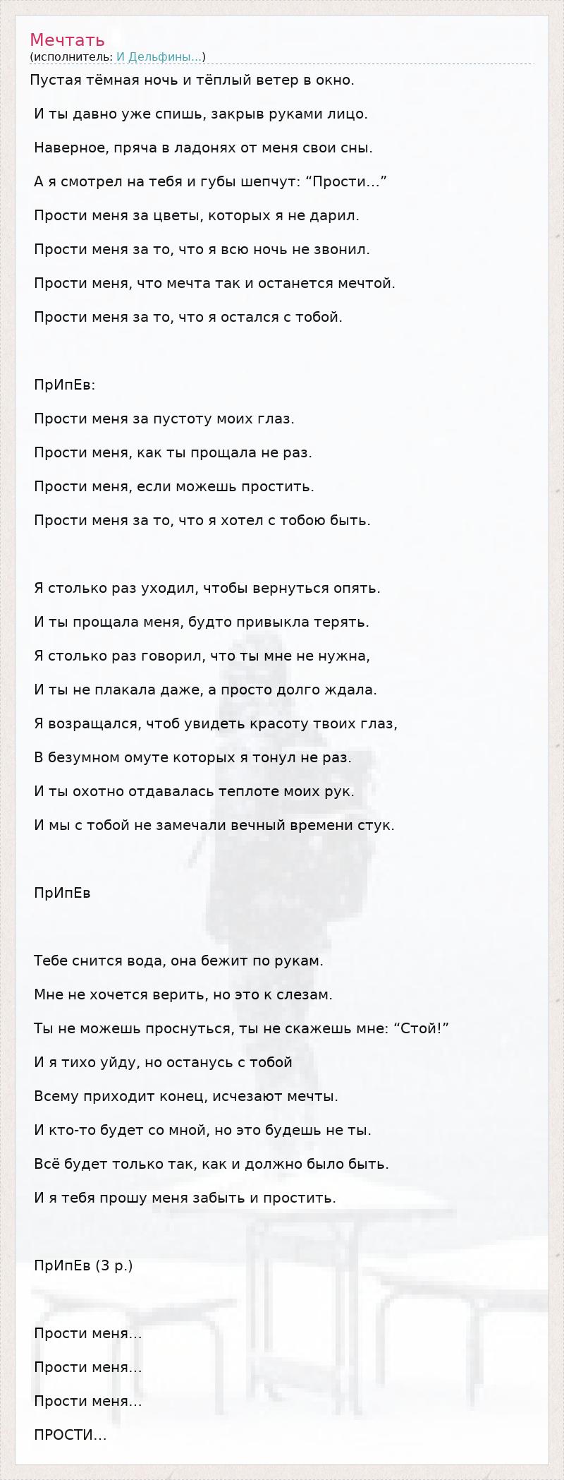 Пустая тёмная ночь и тёплый ветер в окно. И ты давно уже спишь, закрыв руками лицо. Наверное, пряча в ладонях от меня свои сны. А я смотрел на тебя и губы шепчут: “Прости…” Прости меня за цветы, которых я не дарил. Прости меня за то, что я всю ночь не звонил. Прости меня, что мечта так и останется мечтой. Прости меня за то, что я остался с тобой. ПрИпЕв: Прости меня за пустоту моих глаз. Прости меня, как ты прощала не раз. Прости меня, если можешь простить. Прости меня за то, что я хотел с тобою быть. Я столько раз уходил, чтобы вернуться опять. И ты прощала меня, будто привыкла терять. Я столько раз говорил, что ты мне не нужна, И ты не плакала даже, а просто долго ждала. Я возращался, чтоб увидеть красоту твоих глаз, В безумном омуте которых я тонул не раз. И ты охотно отдавалась теплоте моих рук. И мы с тобой не замечали вечный времени стук. ПрИпЕв Тебе снится вода, она бежит по рукам. Мне не хочется верить, но это к слезам. Ты не можешь проснуться, ты не скажешь мне: “Стой!” И я тихо уйду, но останусь с тобой Всему приходит конец, исчезают мечты. И кто-то будет со мной, но это будешь не ты. Всё будет только так, как и должно было быть. И я тебя прошу меня забыть и простить. ПрИпЕв (3 р.) Прости меня… Прости меня… Прости меня… ПРОСТИ…