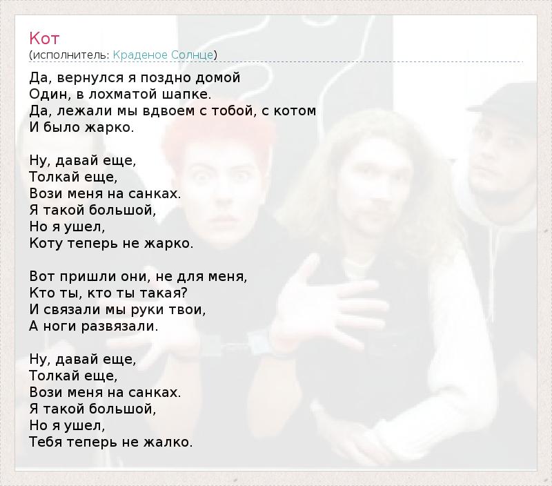 Да, вернулся я поздно домой Один, в лохматой шапке. Да, лежали мы вдвоем с тобой, с котом И было жарко. Ну, давай еще, Толкай еще, Вози меня на санках. Я такой большой, Но я ушел, Коту теперь не жарко. Вот пришли они, не для меня, Кто ты, кто ты такая? И связали мы руки твои, А ноги развязали. Ну, давай еще, Толкай еще, Вози меня на санках. Я такой большой, Но я ушел, Тебя теперь не жалко.
