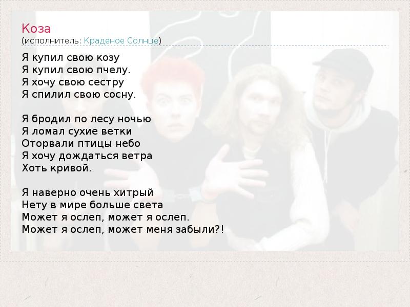 Я купил свою козу Я купил свою пчелу. Я хочу свою сестру Я спилил свою сосну. Я бродил по лесу ночью Я ломал сухие ветки Оторвали птицы небо Я хочу дождаться ветра Хоть кривой. Я наверно очень хитрый Нету в мире больше света Может я ослеп, может я ослеп. Может я ослеп, может меня забыли?!