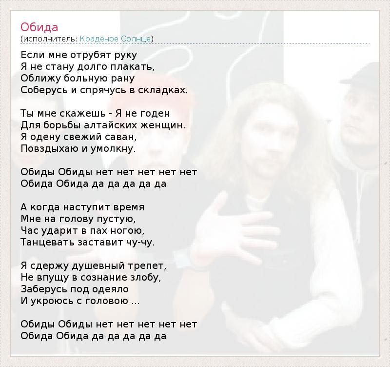 Если мне отрубят руку Я не стану долго плакать, Оближу больную рану Соберусь и спрячусь в складках. Ты мне скажешь - Я не годен Для борьбы алтайских женщин. Я одену свежий саван, Повздыхаю и умолкну. Обиды Обиды нет нет нет нет нет Обида Обида да да да да да А когда наступит время Мне на голову пустую, Час ударит в пах ногою, Танцевать заставит чу-чу. Я сдержу душевный трепет, Не впущу в сознание злобу, Заберусь под одеяло И укроюсь с головою ... Обиды Обиды нет нет нет нет нет Обида Обида да да да да да