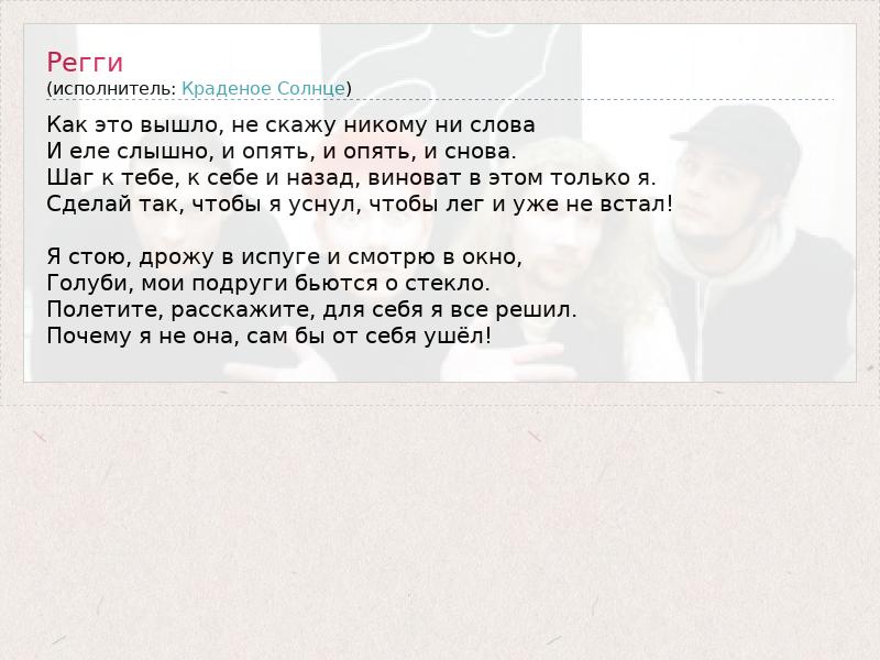 Это интересно:Группа "Краденое Солнце" образовалась в 1993 году в Санкт-Петербурге. Днем рождения коллектива считается 27 марта - дата первого выступления, которое состоялось на сцене ДК Сталепрокатного завода. Первоначальный состав: А.Козьяков, К.Кузин, П.Ключарев. Впоследствии группа время от времени пополнялась и разрасталась, в частности в начале 1994 года к коллективу в качестве вокалиста присоединился... продолжение