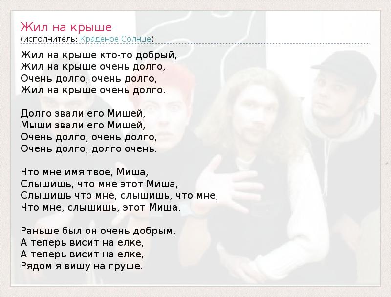 Жил на крыше кто-то добрый, Жил на крыше очень долго, Очень долго, очень долго, Жил на крыше очень долго. Долго звали его Мишей, Мыши звали его Мишей, Очень долго, очень долго, Очень долго, долго очень. Что мне имя твое, Миша, Слышишь, что мне этот Миша, Слышишь что мне, слышишь, что мне, Что мне, слышишь, этот Миша. Раньше был он очень добрым, А теперь висит на елке, А теперь висит на елке, Рядом я вишу на груше.
