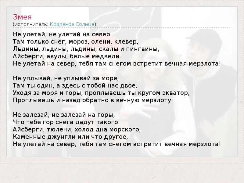 Не улетай, не улетай на север Там только снег, мороз, олени, клевер, Льдины, льдины, льдины, скалы и пингвины, Айсберги, акулы, белые медведи. Не улетай на север, тебя там снегом встретит вечная мерзлота! Не уплывай, не уплывай за море, Там ты один, а здесь с тобой нас двое, Уходя за моря и горы, проплывешь ты кругом экватор, Проплывешь и назад обратно в вечную мерзлоту. Не залезай, не залезай на горы, Что тебе гор снега дадут такого Айсберги, тюлени, холод дна морского, Каменные джунгли или что другое, Не улетай на север, тебя там снегом встретит вечная мерзлота!