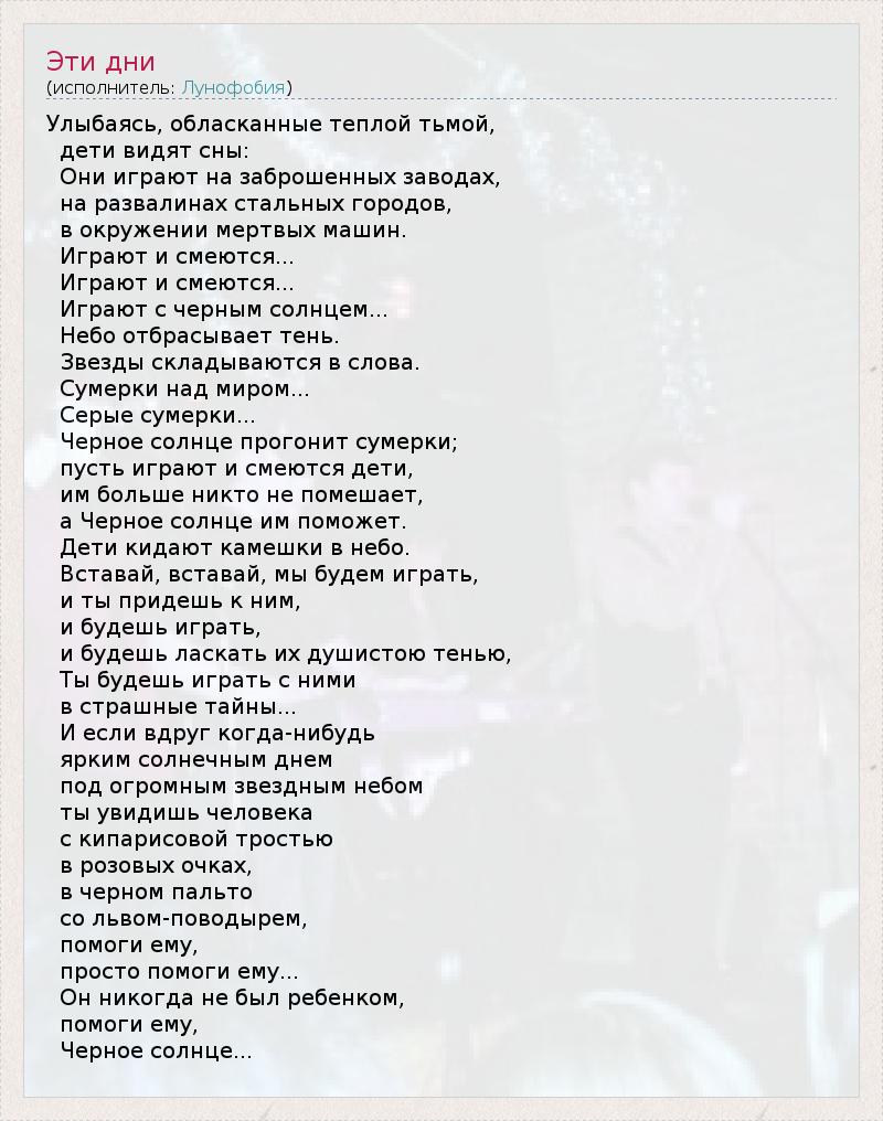 Это интересно:Краткая история:11.97 - образовались11.97 - первый концерт (в "Лесопилке")12.97 - первое демо02.98 - CD-single "Осень"05.98 - CD "Мечты о Солнце07.98 - появился клавишник08.98 - выступление на фестивале "Philips", даже приз какой-то, наверно, за занудство.10.98 - заменили ударника01.99 - клип на "В эти дни"04.99 - Mini-CD "Под снегом"где-то летом 99-ого пришло сообщение... продолжение