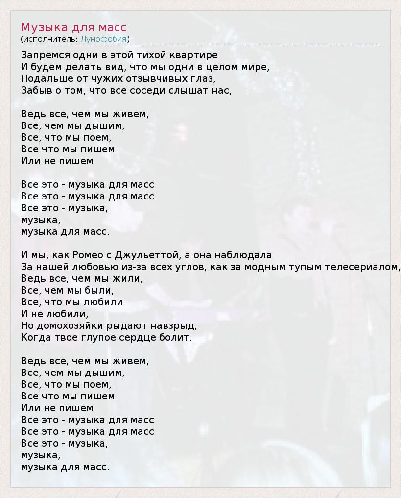 Запремся одни в этой тихой квартире И будем делать вид, что мы одни в целом мире, Подальше от чужих отзывчивых глаз, Забыв о том, что все соседи слышат нас, Ведь все, чем мы живем, Все, чем мы дышим, Все, что мы поем, Все что мы пишем Или не пишем Все это - музыка для масс Все это - музыка для масс Все это - музыка, музыка, музыка для масс. И мы, как Ромео с Джульеттой, а она наблюдала За нашей любовью из-за всех углов, как за модным тупым телесериалом, Ведь все, чем мы жили, Все, чем мы были, Все, что мы любили И не любили, Но домохозяйки рыдают навзрыд, Когда твое глупое сердце болит. Ведь все, чем мы живем, Все, чем мы дышим, Все, что мы поем, Все что мы пишем Или не пишем Все это - музыка для масс Все это - музыка для масс Все это - музыка, музыка, музыка для масс.
