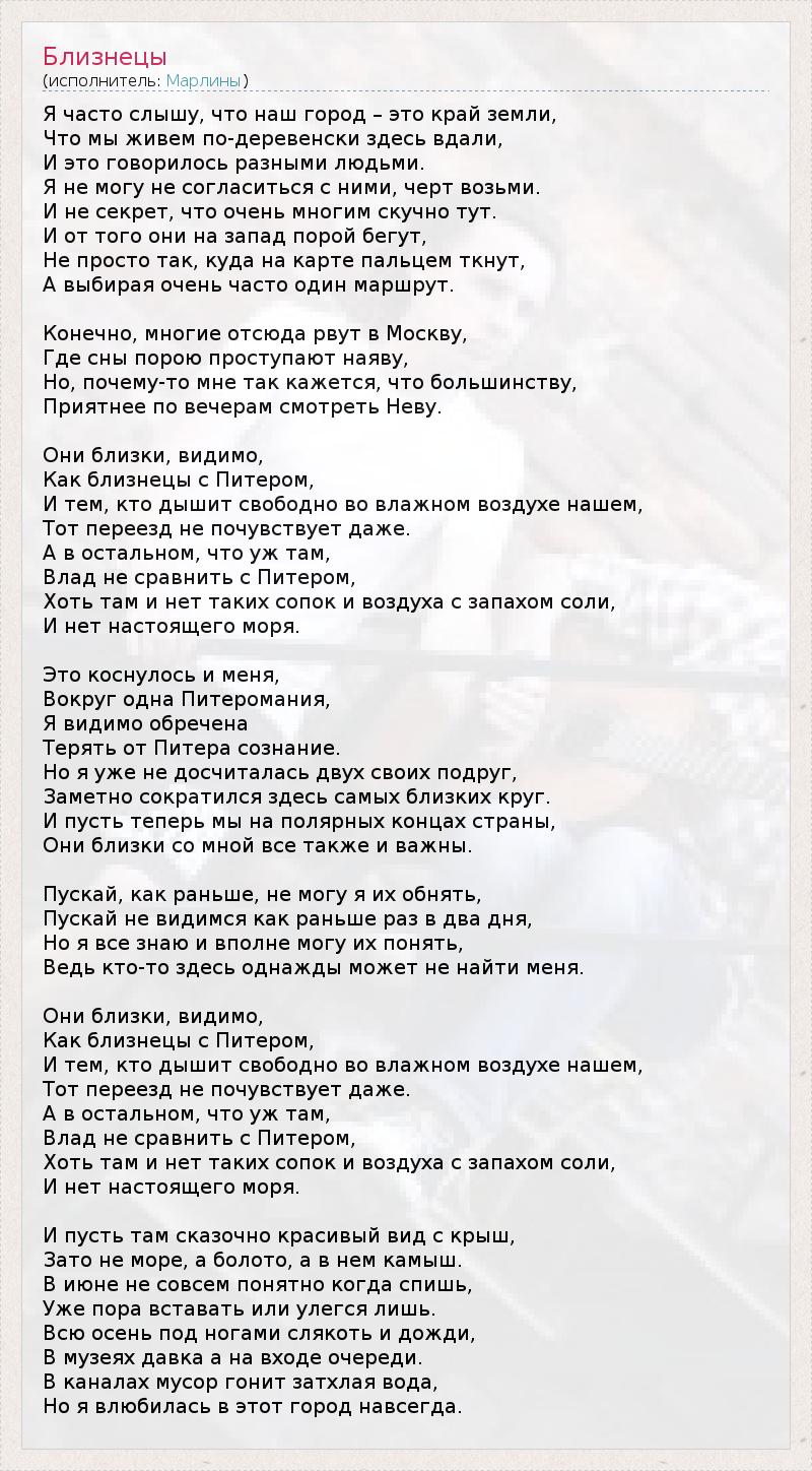 Я часто слышу, что наш город – это край земли, Что мы живем по-деревенски здесь вдали, И это говорилось разными людьми. Я не могу не согласиться с ними, черт возьми. И не секрет, что очень многим скучно тут. И от того они на запад порой бегут, Не просто так, куда на карте пальцем ткнут, А выбирая очень часто один маршрут. Конечно, многие отсюда рвут в Москву, Где сны порою проступают наяву, Но, почему-то мне так кажется, что большинству, Приятнее по вечерам смотреть Неву. Они близки, видимо, Как близнецы с Питером, И тем, кто дышит свободно во влажном воздухе нашем, Тот переезд не почувствует даже. А в остальном, что уж там, Влад не сравнить с Питером, Хоть там и нет таких сопок и воздуха с запахом соли, И нет настоящего моря. Это коснулось и меня, Вокруг одна Питеромания, Я видимо обречена Терять от Питера сознание. Но я уже не досчиталась двух своих подруг, Заметно сократился здесь самых близких круг. И пусть теперь мы на полярных концах страны, Они близки со мной все также и важны. Пускай, как раньше, не могу я их обнять, Пускай не видимся как раньше раз в два дня, Но я все знаю и вполне могу их понять, Ведь кто-то здесь однажды может не найти меня. Они близки, видимо, Как близнецы с Питером, И тем, кто дышит свободно во влажном воздухе нашем, Тот переезд не почувствует даже. А в остальном, что уж там, Влад не сравнить с Питером, Хоть там и нет таких сопок и воздуха с запахом соли, И нет настоящего моря. И пусть там сказочно красивый вид с крыш, Зато не море, а болото, а в нем камыш. В июне не совсем понятно когда спишь, Уже пора вставать или улегся лишь. Всю осень под ногами слякоть и дожди, В музеях давка а на входе очереди. В каналах мусор гонит затхлая вода, Но я влюбилась в этот город навсегда.
