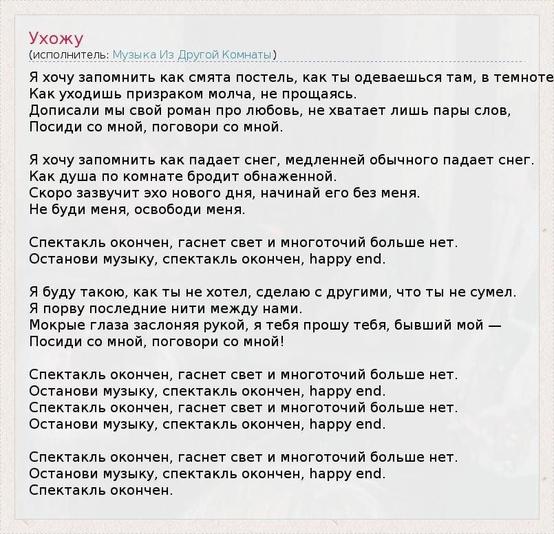 Я хочу запомнить как смята постель, как ты одеваешься там, в темноте Как уходишь призраком молча, не прощаясь. Дописали мы свой роман про любовь, не хватает лишь пары слов, Посиди со мной, поговори со мной. Я хочу запомнить как падает снег, медленней обычного падает снег. Как душа по комнате бродит обнаженной. Скоро зазвучит эхо нового дня, начинай его без меня. Не буди меня, освободи меня. Спектакль окончен, гаснет свет и многоточий больше нет. Останови музыку, спектакль окончен, happy end. Я буду такою, как ты не хотел, сделаю с другими, что ты не сумел. Я порву последние нити между нами. Мокрые глаза заслоняя рукой, я тебя прошу тебя, бывший мой — Посиди со мной, поговори со мной! Спектакль окончен, гаснет свет и многоточий больше нет. Останови музыку, спектакль окончен, happy end. Спектакль окончен, гаснет свет и многоточий больше нет. Останови музыку, спектакль окончен, happy end. Спектакль окончен, гаснет свет и многоточий больше нет. Останови музыку, спектакль окончен, happy end. Спектакль окончен.