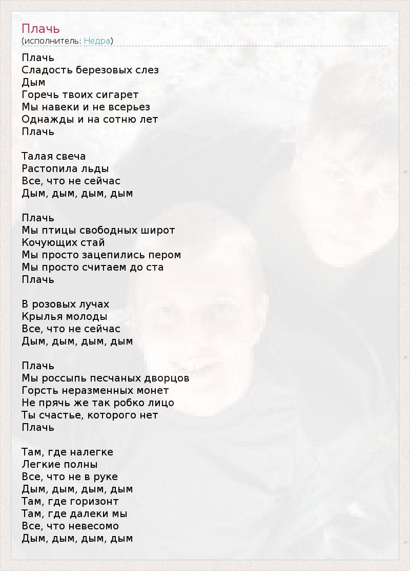 Плачь Сладость березовых слез Дым Горечь твоих сигарет Мы навеки и не всерьез Однажды и на сотню лет Плачь Талая свеча Растопила льды Все, что не сейчас Дым, дым, дым, дым Плачь Мы птицы свободных широт Кочующих стай Мы просто зацепились пером Мы просто считаем до ста Плачь В розовых лучах Крылья молоды Все, что не сейчас Дым, дым, дым, дым Плачь Мы россыпь песчаных дворцов Горсть неразменных монет Не прячь же так робко лицо Ты счастье, которого нет Плачь Там, где налегке Легкие полны Все, что не в руке Дым, дым, дым, дым Там, где горизонт Там, где далеки мы Все, что невесомо Дым, дым, дым, дым