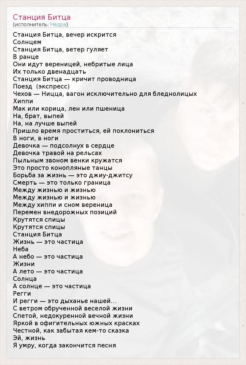 Станция Битца, вечер искрится Солнцем Станция Битца, ветер гуляет В ранце Они идут вереницей, небритые лица Их только двенадцать Станция Битца — кричит проводница Поезд (экспресс) Чехов — Ницца, вагон исключительно для бледнолицых Хиппи Мак или корица, лен или пшеница На, брат, выпей На, на лучше выпей Пришло время проститься, ей поклониться В ноги, в ноги Девочка — подсолнух в сердце Девочка травой на рельсах Пыльным звоном венки кружатся Это просто конопляные танцы Борьба за жизнь — это джиу-джитсу Смерть — это только граница Между жизнью и жизнью Между жизнью и жизнью Между хиппи и сном вереница Перемен внедорожных позиций Крутятся спицы Крутятся спицы Станция Битца Жизнь — это частица Неба А небо — это частица Жизни А лето — это частица Солнца А солнце — это частица Регги И регги — это дыханье нашей… С ветром обрученной веселой жизни Спетой, недокуренной вечной жизни Яркой в офигительных южных красках Честной, как забытая кем-то сказка Эй, жизнь Я умру, когда закончится песня
