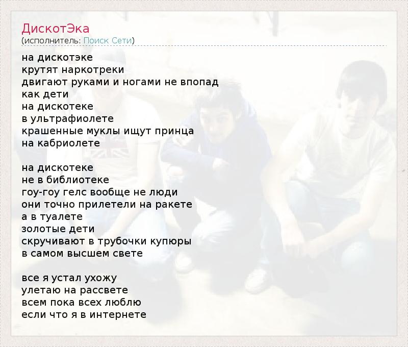 на дискотэке крутят наркотреки двигают руками и ногами не впопад как дети на дискотеке в ультрафиолете крашенные муклы ищут принца на кабриолете на дискотеке не в библиотеке гоу-гоу гелс вообще не люди они точно прилетели на ракете а в туалете золотые дети скручивают в трубочки купюры в самом высшем свете все я устал ухожу улетаю на рассвете всем пока всех люблю если что я в интернете
