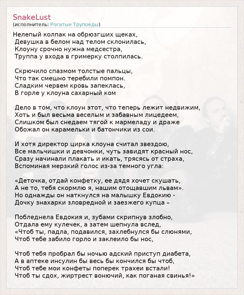 Нелепый колпак на обрюзгших щеках, Девушка в белом над телом склонилась, Клоуну срочно нужна медсестра, Труппа у входа в гримерку столпилась. Скрючило спазмом толстые пальцы, Что так смешно теребили помпон. Сладким червем кровь запеклась, В горле у клоуна сахарный ком Дело в том, что клоун этот, что теперь лежит недвижим, Хоть и был весьма веселым и забавным лицедеем, Слишком был снедаем тягой к мармеладу и драже Обожал он карамельки и батончики из сои. И хотя директор цирка клоуна считал звездою, Все мальчишки и девчонки, чуть завидят красный нос, Сразу начинали плакать и икать, трясясь от страха, Вспоминая мерзкий голос из-за темного угла: «Деточка, отдай конфетку, ее дядя хочет скушать, А не то, тебя скормлю я, нашим отощавшим львам». Но однажды он наткнулся на малышку Евдокию - Дочку знахарки зловредной и заезжего купца – Побледнела Евдокия и, зубами скрипнув злобно, Отдала ему кулечек, а затем шепнула вслед, «Чтоб ты, падла, подавился, захлебнулся бы слюнями, Чтоб тебе забило горло и заклеило бы нос, Чтоб тебя пробрал бы ночью адский приступ диабета, А в аптеке инсулин бы весь бы кончился бы чтоб, Чтоб тебе мои конфеты поперек трахеи встали! Чтоб ты сдох, жиртрест вонючий, как поганая свинья!»