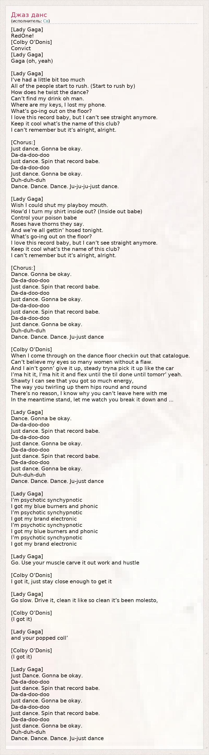 [Lady Gaga] RedOne! [Colby O'Donis] Convict [Lady Gaga] Gaga (oh, yeah) [Lady Gaga] I’ve had a little bit too much All of the people start to rush. (Start to rush by) How does he twist the dance? Can’t find my drink oh man. Where are my keys, I lost my phone. What’s go-ing out on the floor? I love this record baby, but I can’t see straight anymore. Keep it cool what’s the name of this club? I can’t remember but it’s alright, alright. [Chorus:] Just dance. Gonna be okay. Da-da-doo-doo Just dance. Spin that record babe. Da-da-doo-doo Just dance. Gonna be okay. Duh-duh-duh Dance. Dance. Dance. Ju-ju-ju-just dance. [Lady Gaga] Wish I could shut my playboy mouth. How’d I turn my shirt inside out? (Inside out babe) Control your poison babe Roses have thorns they say. And we’re all gettin’ hosed tonight. What’s go-ing out on the floor? I love this record baby, but I can’t see straight anymore. Keep it cool what’s the name of this club? I can’t remember but it’s alright, alright. [Chorus:] Dance. Gonna be okay. Da-da-doo-doo Just dance. Spin that record babe. Da-da-doo-doo Just dance. Gonna be okay. Da-da-doo-doo Just dance. Spin that record babe. Da-da-doo-doo Just dance. Gonna be okay. Duh-duh-duh Dance. Dance. Dance. Ju-just dance [Colby O'Donis] When I come through on the dance floor checkin out that catalogue. Can’t believe my eyes so many women without a flaw. And I ain’t gonn’ give it up, steady tryna pick it up like the car I’ma hit it, I’ma hit it and flex until the til done until tomorr’ yeah. Shawty I can see that you got so much energy, The way you twirling up them hips round and round There’s no reason, I know why you can’t leave here with me In the meantime stand, let me watch you break it down and ... [Lady Gaga] Dance. Gonna be okay. Da-da-doo-doo Just dance. Spin that record babe. Da-da-doo-doo Just dance. Gonna be okay. Da-da-doo-doo Just dance. Spin that record babe. Da-da-doo-doo Just dance. Gonna be okay. Duh-duh-duh Dance. Dance. Dance. Ju-just dance [Lady Gaga] I’m psychotic synchypnotic I got my blue burners and phonic I’m psychotic synchypnotic I got my brand electronic I’m psychotic synchypnotic I got my blue burners and phonic I’m psychotic synchypnotic I got my brand electronic [Lady Gaga] Go. Use your muscle carve it out work and hustle [Colby O'Donis] I got it, just stay close enough to get it [Lady Gaga] Go slow. Drive it, clean it like so clean it’s been molesto, [Colby O'Donis] (I got it) [Lady Gaga] and your popped coll’ [Colby O'Donis] (I got it) [Lady Gaga] Just Dance. Gonna be okay. Da-da-doo-doo Just dance. Spin that record babe. Da-da-doo-doo Just dance. Gonna be okay. Da-da-doo-doo Just dance. Spin that record babe. Da-da-doo-doo Just dance. Gonna be okay. Duh-duh-duh Dance. Dance. Dance. Ju-just dance