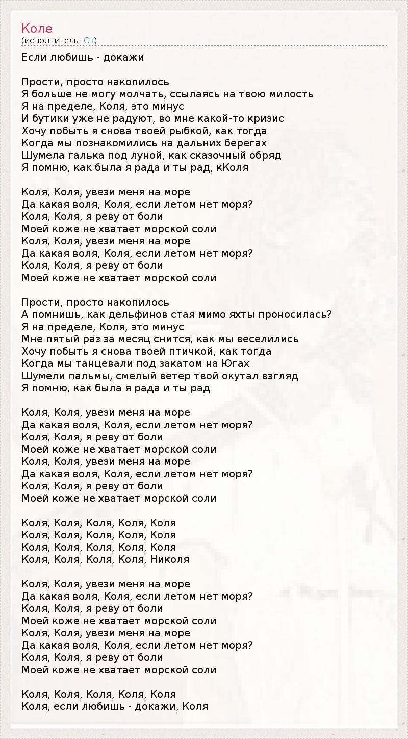 Если любишь - докажи Прости, просто накопилось Я больше не могу молчать, ссылаясь на твою милость Я на пределе, Коля, это минус И бутики уже не радуют, во мне какой-то кризис Хочу побыть я снова твоей рыбкой, как тогда Когда мы познакомились на дальних берегах Шумела галька под луной, как сказочный обряд Я помню, как была я рада и ты рад, кКоля Коля, Коля, увези меня на море Да какая воля, Коля, если летом нет моря? Коля, Коля, я реву от боли Моей коже не хватает морской соли Коля, Коля, увези меня на море Да какая воля, Коля, если летом нет моря? Коля, Коля, я реву от боли Моей коже не хватает морской соли Прости, просто накопилось А помнишь, как дельфинов стая мимо яхты проносилась? Я на пределе, Коля, это минус Мне пятый раз за месяц снится, как мы веселились Хочу побыть я снова твоей птичкой, как тогда Когда мы танцевали под закатом на Югах Шумели пальмы, смелый ветер твой окутал взгляд Я помню, как была я рада и ты рад Коля, Коля, увези меня на море Да какая воля, Коля, если летом нет моря? Коля, Коля, я реву от боли Моей коже не хватает морской соли Коля, Коля, увези меня на море Да какая воля, Коля, если летом нет моря? Коля, Коля, я реву от боли Моей коже не хватает морской соли Коля, Коля, Коля, Коля, Коля Коля, Коля, Коля, Коля, Коля Коля, Коля, Коля, Коля, Коля Коля, Коля, Коля, Коля, Николя Коля, Коля, увези меня на море Да какая воля, Коля, если летом нет моря? Коля, Коля, я реву от боли Моей коже не хватает морской соли Коля, Коля, увези меня на море Да какая воля, Коля, если летом нет моря? Коля, Коля, я реву от боли Моей коже не хватает морской соли Коля, Коля, Коля, Коля, Коля Коля, если любишь - докажи, Коля