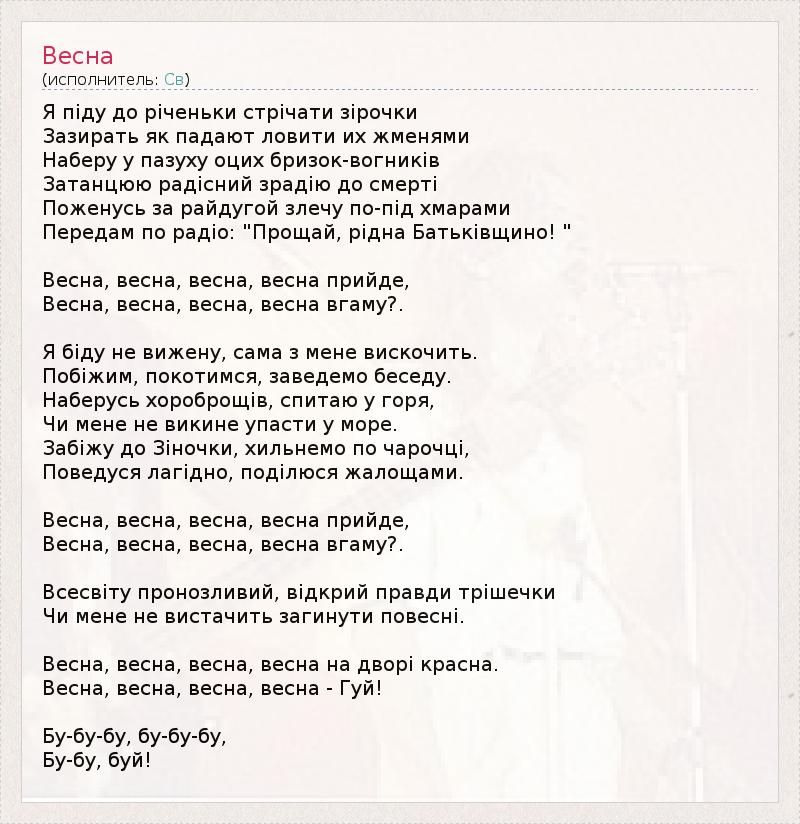 Я пiду до рiченьки стрiчати зiрочки Зазирать як падают ловити их жменями Наберу у пазуху оцих бризок-вогникiв Затанцюю радiсний зрадiю до смертi Поженусь за райдугой злечу по-пiд хмарами Передам по радiо: "Прощай, рiдна Батькiвщино! " Весна, весна, весна, весна прийде, Весна, весна, весна, весна вгаму?. Я бiду не вижену, сама з мене вискочить. Побiжим, покотимся, заведемо беседу. Наберусь хороброщiв, спитаю у горя, Чи мене не викине упасти у море. Забiжу до Зiночки, хильнемо по чарочцi, Поведуся лагiдно, подiлюся жалощами. Весна, весна, весна, весна прийде, Весна, весна, весна, весна вгаму?. Всесвiту пронозливий, вiдкрий правди трiшечки Чи мене не вистачить загинути повеснi. Весна, весна, весна, весна на дворi красна. Весна, весна, весна, весна - Гуй! Бу-бу-бу, бу-бу-бу, Бу-бу, буй!