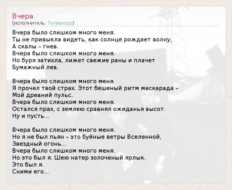 Это интересно:Группа "Телевизор" образовалась в Ленинграде в 1984 году на обломках арт-роковой группы "Озеро" и дебютировала сразу на 2 фестивале Ленинградского Рок-клуба 1984 года, войдя в число лауреатов, причем лидер группы, студент английского отделения филфака Ленинградского ГосУниверситета Михаил Борзыкин был отдельно отмечен как автор лучших текстов. Столь же успешно выступил "Телевизор"... продолжение