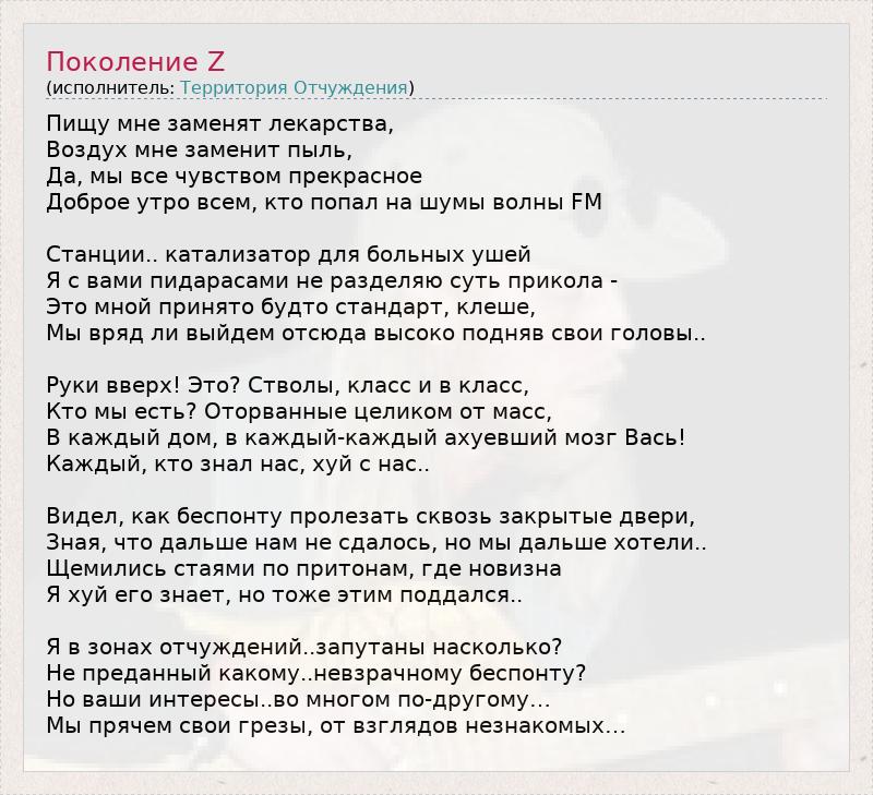 Пищу мне заменят лекарства, Воздух мне заменит пыль, Да, мы все чувством прекрасное Доброе утро всем, кто попал на шумы волны FM Станции.. катализатор для больных ушей Я с вами пидарасами не разделяю суть прикола - Это мной принято будто стандарт, клеше, Мы вряд ли выйдем отсюда высоко подняв свои головы.. Руки вверх! Это? Стволы, класс и в класс, Кто мы есть? Оторванные целиком от масс, В каждый дом, в каждый-каждый ахуевший мозг Вась! Каждый, кто знал нас, хуй с нас.. Видел, как беспонту пролезать сквозь закрытые двери, Зная, что дальше нам не сдалось, но мы дальше хотели.. Щемились стаями по притонам, где новизна Я хуй его знает, но тоже этим поддался.. Я в зонах отчуждений..запутаны насколько? Не преданный какому..невзрачному беспонту? Но ваши интересы..во многом по-другому… Мы прячем свои грезы, от взглядов незнакомых…