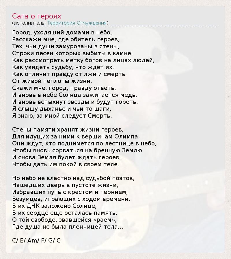 Город, уходящий домами в небо, Расскажи мне, где обитель героев, Тех, чьи души замурованы в стены, Строки песен которых выбиты в камне. Как рассмотреть метку богов на лицах людей, Как увидеть судьбу, что ждет их, Как отличит правду от лжи и смерть От живой теплоты жизни. Скажи мне, город, правду ответь, И вновь в небе Солнца зажигается медь, И вновь вспыхнут звезды и будут гореть. Я слышу дыханье и чьи-то шаги, Я знаю, за мной следует Смерть. Стены памяти хранят жизни героев, Для идущих за ними к вершинам Олимпа. Они ждут, кто поднимется по лестнице в небо, Чтобы вновь сорваться на бренную Землю. И снова Земля будет ждать героев, Чтобы дать им покой в своем теле. Но небо не властно над судьбой поэтов, Нашедших дверь в пустоте жизни, Избравших путь с крестом и тернием, Безумцев, играющих с ходом времени. В их ДНК заложено Солнце, В их сердце еще осталась память, О той свободе, звавшейся «раем», Где душа не была пленницей тела… C/ E/ Am/ F/ G/ C