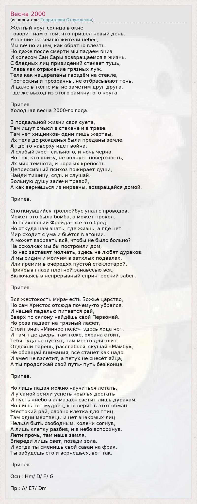 Жёлтый круг солнца в окне Говорит нам о том, что пришёл новый день. Упавшие на землю жители небес, Мы вечно ищем, как обратно влезть. Но даже после смерти мы падаем вниз, И колесом Сан Сары возвращаемся в жизнь. С бледных лиц привидений стекает тушь, Глаза как отражение грязных луж. Тела как нацарапаны гвоздём на стекле, Гротескны и прозрачны, не отбрасывают тень. И даже в толпе мы не заметим друг друга, Где же выход из этого замкнутого круга. Припев: Холодная весна 2000-го года. В подвальной жизни своя суета, Там ищут смысл в стакане и в траве. Там нет хищников- одни лишь жертвы, Их тела до рожденья были преданы земле. А где-то наверху идёт война, И слабый жрёт сильного, и ночь черна. Но тех, кто внизу, не волнует поверхность, Их мир темнота, и нора их крепость. Депрессивный психоз пожирает души, Найди тишину, сядь и слушай. Больную душу залечи травой, А как вернёшься из нирваны, возвращайся домой. Припев. Споткнувшийся троллейбус упал с проводов, Может это была бомба, а может прокол. По психологии Фрейда- всё это бред, Но откуда нам знать, где жизнь, а где нет. Мир сходит с ума и бьётся в агонии. А может взорвать всё, чтобы не было больно? На осколках мы бы построили дом, Но нас заставят молчать, здесь не любят дураков. И мы сидим и молчим в затхлых подвалах, Или гремим в очередях пустой стеклотарой. Прикрыв глаза плотной занавесью век, Включаясь в непрерывный спринтерский забег. Припев. Вся жестокость мира- есть Божье царство, Но сам Христос отсюда почему-то убрался. И нашей падалью питается рай, Вверх по склону найдёшь свой Первомай. Но роза падает на грязный лафет, Стоит знак «Минное поле»- здесь хода нет. И там, где дверь, там тоже, охрана стоит, Тебя туда не пустят, там место для элит. Отдохни парень, расслабься, скушай «Мамбу», Не обращай внимания, всё станет как надо. И змея не взлетит, а петух не снесёт яйца, А ты продолжай свой путь- путь без конца. Припев. Но лишь падая можно научиться летать, И у самой земли успеть крылья достать И пусть «небо в алмазах» светит лишь дуракам, Но лишь тот мудрец, кто верит в этот обман. Жестокий рай, словно клетка для птиц, Там одни мертвецы и нет знакомых лиц. Нельзя быть свободным, колени согнув, А лишь клетку разбив, и в небо вспорхнув. Лети прочь, там наша земля, Впереди лишь свет, позади зола. И когда ты сменишь свой саван на фрак, Ты забудешь его и вернёшься, вот так. Припев. Осн.: Hm/ D/ E/ G Пр.: A/ E7/ Dm