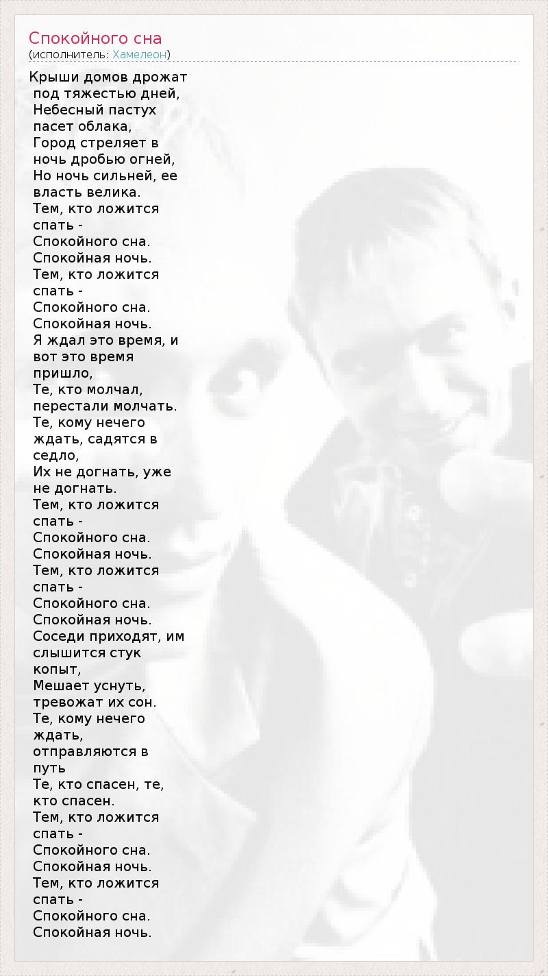Крыши домов дрожат под тяжестью дней, Небесный пастух пасет облака, Город стреляет в ночь дробью огней, Но ночь сильней, ее власть велика. Тем, кто ложится спать - Спокойного сна. Спокойная ночь. Тем, кто ложится спать - Спокойного сна. Спокойная ночь. Я ждал это время, и вот это время пришло, Те, кто молчал, перестали молчать. Те, кому нечего ждать, садятся в седло, Их не догнать, уже не догнать. Тем, кто ложится спать - Спокойного сна. Спокойная ночь. Тем, кто ложится спать - Спокойного сна. Спокойная ночь. Соседи приходят, им слышится стук копыт, Мешает уснуть, тревожат их сон. Те, кому нечего ждать, отправляются в путь Те, кто спасен, те, кто спасен. Тем, кто ложится спать - Спокойного сна. Спокойная ночь. Тем, кто ложится спать - Спокойного сна. Спокойная ночь.