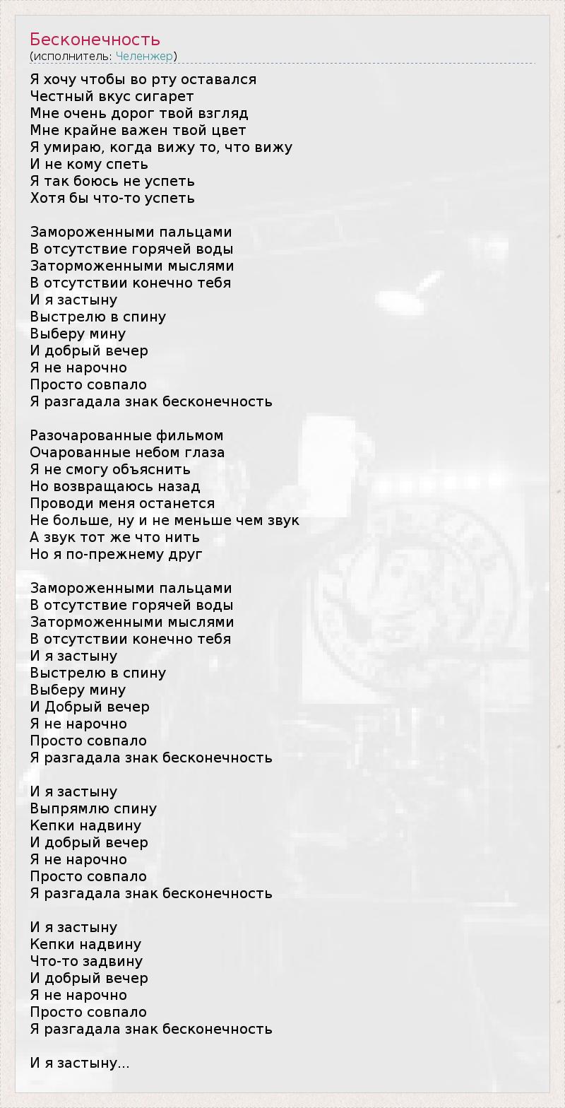 Я хочу чтобы во рту оставался Честный вкус сигарет Мне очень дорог твой взгляд Мне крайне важен твой цвет Я умираю, когда вижу то, что вижу И не кому спеть Я так боюсь не успеть Хотя бы что-то успеть Замороженными пальцами В отсутствие горячей воды Заторможенными мыслями В отсутствии конечно тебя И я застыну Выстрелю в спину Выберу мину И добрый вечер Я не нарочно Просто совпало Я разгадала знак бесконечность Разочарованные фильмом Очарованные небом глаза Я не смогу объяснить Но возвращаюсь назад Проводи меня останется Не больше, ну и не меньше чем звук А звук тот же что нить Но я по-прежнему друг Замороженными пальцами В отсутствие горячей воды Заторможенными мыслями В отсутствии конечно тебя И я застыну Выстрелю в спину Выберу мину И Добрый вечер Я не нарочно Просто совпало Я разгадала знак бесконечность И я застыну Выпрямлю спину Кепки надвину И добрый вечер Я не нарочно Просто совпало Я разгадала знак бесконечность И я застыну Кепки надвину Что-то задвину И добрый вечер Я не нарочно Просто совпало Я разгадала знак бесконечность И я застыну... Земфира - Бесконечность