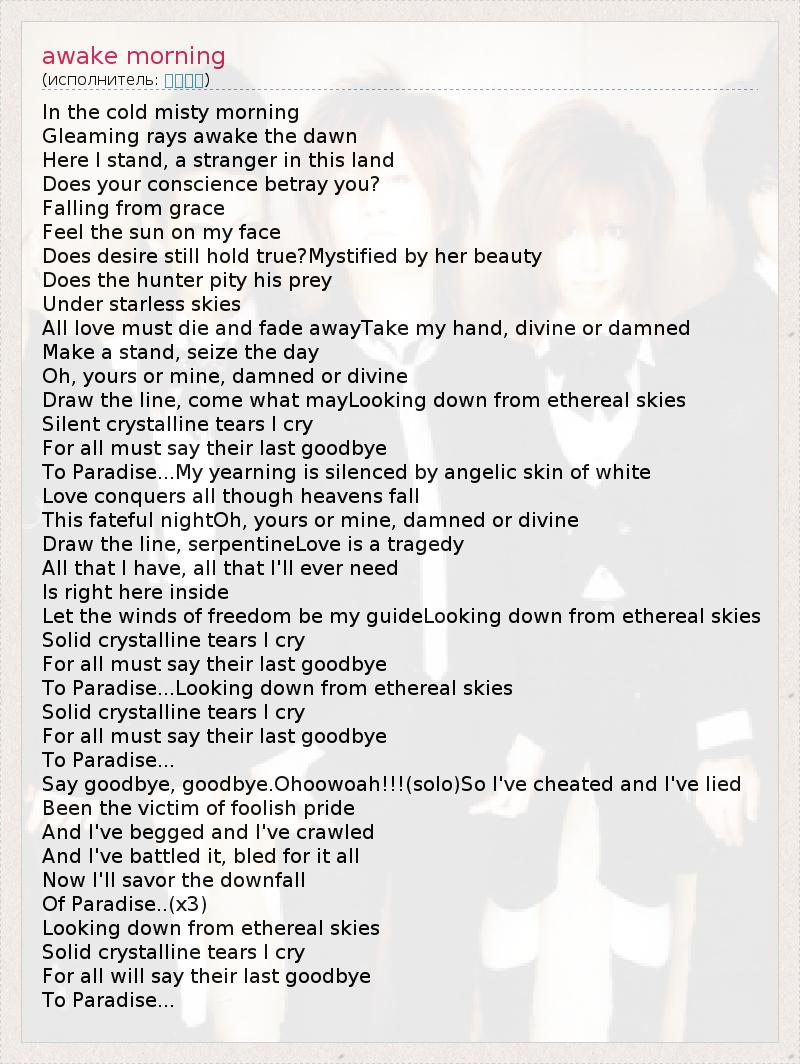 In the cold misty morning Gleaming rays awake the dawn Here I stand, a stranger in this land Does your conscience betray you? Falling from grace Feel the sun on my face Does desire still hold true?Mystified by her beauty Does the hunter pity his prey Under starless skies All love must die and fade awayTake my hand, divine or damned Make a stand, seize the day Oh, yours or mine, damned or divine Draw the line, come what mayLooking down from ethereal skies Silent crystalline tears I cry For all must say their last goodbye To Paradise...My yearning is silenced by angelic skin of white Love conquers all though heavens fall This fateful nightOh, yours or mine, damned or divine Draw the line, serpentineLove is a tragedy All that I have, all that I'll ever need Is right here inside Let the winds of freedom be my guideLooking down from ethereal skies Solid crystalline tears I cry For all must say their last goodbye To Paradise...Looking down from ethereal skies Solid crystalline tears I cry For all must say their last goodbye To Paradise... Say goodbye, goodbye.Ohoowoah!!!(solo)So I've cheated and I've lied Been the victim of foolish pride And I've begged and I've crawled And I've battled it, bled for it all Now I'll savor the downfall Of Paradise..(x3) Looking down from ethereal skies Solid crystalline tears I cry For all will say their last goodbye To Paradise...