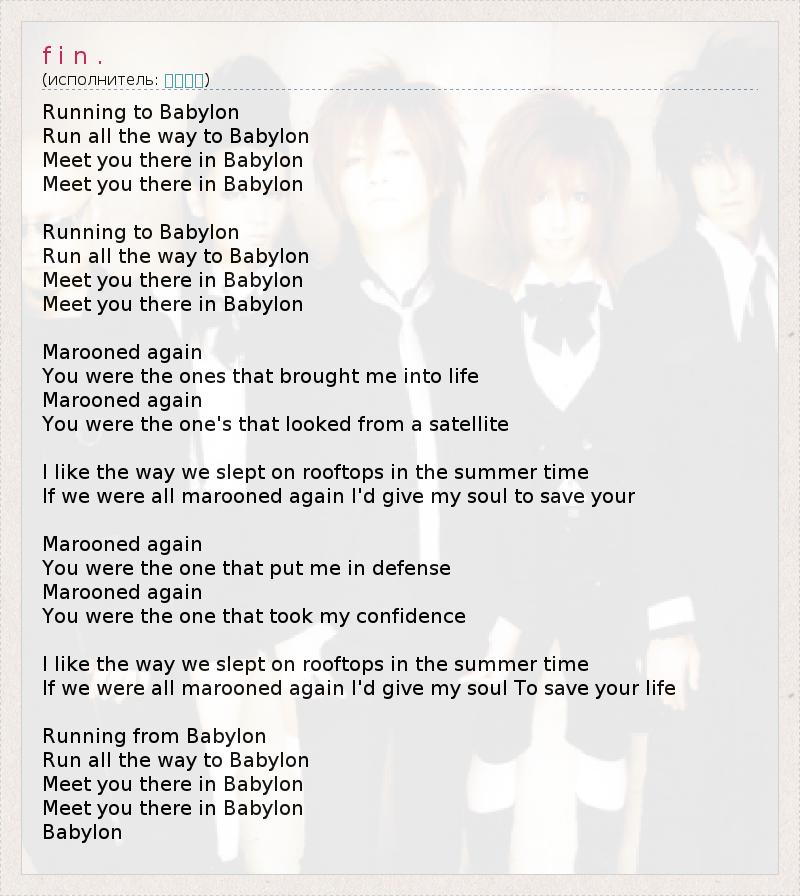 Беги в Вавилон! Все пути приведут тебя в Вавилон! Встретимся здесь, в Вавилоне. Встретимся здесь, в Вавилоне. Беги в Вавилон! Все пути приведут тебя в Вавилон! Встретимся здесь, в Вавилоне. Встретимся здесь, в Вавилоне. Я снова потерял тебя. Ты одна вернула меня к жизни. Я снова потерял тебя. Ты одна была моим сторонником. Мне нравилось засыпать с тобой на крыше летними вечерами. Если мы опять потеряемся, моя душа будет охранять тебя. Я снова потерял тебя. Ты одна защищала меня. Я снова потерял тебя. Ты одна прятала меня. Мне нравилось засыпать с тобой на крыше летними вечерами. Если мы опять потеряемся, моя душа спасет тебя. Беги в Вавилон! Все пути приведут тебя в Вавилон! Встретимся здесь, в Вавилоне. Встретимся здесь, в Вавилоне. Вавилон!