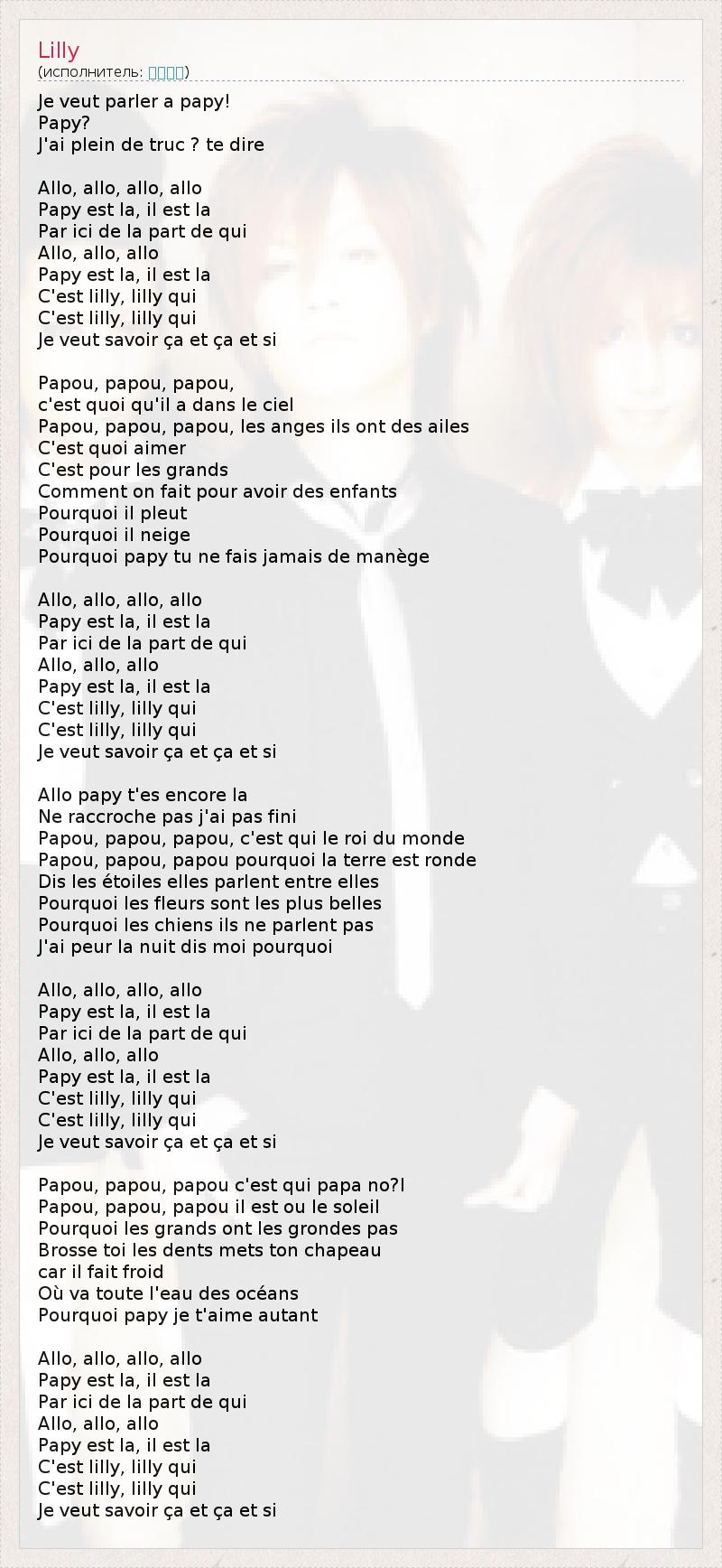 Я хочу поговорить с папой! Папочка? Я хочу тебе сказать... Алло, алло, алло, алло Папа я узнать хочу, Что в трубке 1 делаешь, что? Алло, алло, алло, алло! Что в трубке делаешь, что? Это Лили, это Лили, Это Лили, это Лили! Она хочет знать всё, как ты! Папа, папа, папа, Что в небе так бело? Папа, папа, папа, это ангела крыло? Что такое любовь? Что такое взрослеть? Откуда берутся дети? Из чего же снег лепят? И откуда льется дождь? И почему ты папуль, верхом на лошадке не катаешься, а? Алло, алло, алло, алло Папа я узнать хочу, Что в трубке делаешь, что? Алло, алло, алло, алло! Что в трубке делаешь, что? Это Лили, это Лили, Это Лили, это Лили! Она хочет знать всё, как ты! Алло, папа! Ты еще тут? Не вешай трубку, я еще говорю! Папа, папа, папа, а кто же мира царь? Папа, папа, папа, почему земля кругла как шар? И почему звезды такие молчаливые? А цветы – самые красивые? Почему собаки только лают? Я боюсь темноты, объясни почему? Алло, алло, алло, алло Папа я узнать хочу, Что в трубке делаешь, что? Алло, алло, алло, алло! Что в трубке делаешь, что? Это Лили, это Лили, Это Лили, это Лили! Она хочет знать всё, как ты! Папа, папа, папа, а Санта это кто? Папа, папа, папа, куда солнце ложится спать? Почему взрослых не могут наругать? Не забыл почистить зубки? А надел шляпу? Сегодня холодно, без нее ходить не надо! Почему в морях так много воды? Почему я тебя люблю, а меня ты? Алло, алло, алло, алло Папа я узнать хочу, Что в трубке делаешь, что? Алло, алло, алло, алло! Что в трубке делаешь, что? Это Лили, это Лили, Это Лили, это Лили! Она хочет знать всё, как ты! * поэтический перевод с элементами творческой интерпретации. ** В этой песне, по мнению французов, представлены самые часто задаваемые вопросы детей 1 - трубка – телефонная труба