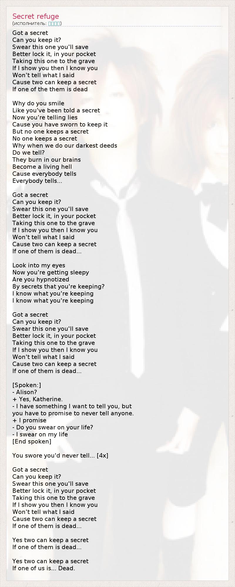 У меня есть тайна, Можешь ли ты сохранить ее? Клянись, что эту тайну ты сохранишь, Лучше спрячь ее у себя в кармане, Забери ее с собой в могилу. Если я открою её тебе, значит, я уверена, что ты Никому не расскажешь об услышанном, Потому что двое могут хранить тайну Только в том случае, если один из них мертв. Почему ты улыбаешься, Как будто с тобой поделились секретом? И теперь ты врешь, Потому что поклялась сохранить ее. Но никто не хранит тайны, Никто не хранит тайны. Почему когда мы совершаем самые плохие поступки, Мы рассказываем о них? Они прожигают нам мозг, Становятся сущим адом, Потому что все говорят, Все говорят ... У меня есть тайна, Можешь ли ты сохранить ее? Клянись, что эту тайну ты сохранишь, Лучше спрячь ее у себя в кармане, Забери ее с собой в могилу. Если я открою её тебе, значит, я уверена, что ты Никому не расскажешь об услышанном, Потому что двое могут хранить тайну Только в том случае, если один из них мертв. Посмотри в мои глаза - Ну вот - ты засыпаешь. Ты загипнотизирована Тайнами, которые пытаешься сохранить? Я знаю, что ты скрываешь, Я знаю, что ты скрываешь... У меня есть тайна, Можешь ли ты сохранить ее? Клянись, что эту тайну ты сохранишь, Лучше спрячь ее у себя в кармане, Забери ее с собой в могилу. Если я открою её тебе, значит, я уверена, что ты Никому не расскажешь об услышанном, Потому что двое могут хранить тайну Только в том случае, если один из них мертв. [Разговор:] - Элисон? + Да, Кэтрин. - У меня есть то, что я хочу тебе сказать, но Ты должна пообещать, что никому об этом не расскажешь. + Я обещаю. - Клянешься ли ты жизнью? + Клянусь жизнью. [Конец разговора] Ты поклялась, никогда никому не говорить... [4x] У меня есть тайна, Можешь ли ты сохранить ее? Клянись, что эту тайну ты сохранишь, Лучше спрячь ее у себя в кармане, Забери ее с собой в могилу. Если я открою её тебе, значит, я уверена, что ты Никому не расскажешь об услышанном, Потому что двое могут хранить тайну Только в том случае, если один из них мертв. Да, двое могут хранить тайну Только в том случае, если один из них мертв. Да, двое могут хранить тайну Только в том случае, если один из нас... Мертва.