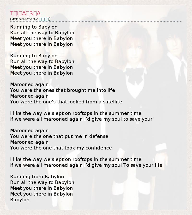 Беги в Вавилон! Все пути приведут тебя в Вавилон! Встретимся здесь, в Вавилоне. Встретимся здесь, в Вавилоне. Беги в Вавилон! Все пути приведут тебя в Вавилон! Встретимся здесь, в Вавилоне. Встретимся здесь, в Вавилоне. Я снова потерял тебя. Ты одна вернула меня к жизни. Я снова потерял тебя. Ты одна была моим сторонником. Мне нравилось засыпать с тобой на крыше летними вечерами. Если мы опять потеряемся, моя душа будет охранять тебя. Я снова потерял тебя. Ты одна защищала меня. Я снова потерял тебя. Ты одна прятала меня. Мне нравилось засыпать с тобой на крыше летними вечерами. Если мы опять потеряемся, моя душа спасет тебя. Беги в Вавилон! Все пути приведут тебя в Вавилон! Встретимся здесь, в Вавилоне. Встретимся здесь, в Вавилоне. Вавилон!