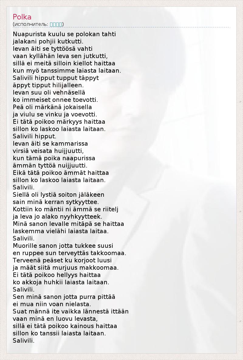 Nuapurista kuulu se polokan tahti jalakani pohjii kutkutti. Ievan äiti se tyttöösä vahti vaan kyllähän Ieva sen jutkutti, sillä ei meitä silloin kiellot haittaa kun myö tanssimme laiasta laitaan. Salivili hipput tupput täppyt äppyt tipput hilijalleen. Ievan suu oli vehnäsellä ko immeiset onnee toevotti. Peä oli märkänä jokaisella ja viulu se vinku ja voevotti. Ei tätä poikoo märkyys haittaa sillon ko laskoo laiasta laitaan. Salivili hipput. Ievan äiti se kammarissa virsiä veisata huijjuutti, kun tämä poika naapurissa ämmän tyttöä nuijjuutti. Eikä tätä poikoo ämmät haittaa sillon ko laskoo laiasta laitaan. Salivili. Siellä oli lystiä soiton jäläkeen sain minä kerran sytkyyttee. Kottiin ko mäntii ni ämmä se riitelj ja Ieva jo alako nyyhkyytteek. Minä sanon Ievalle mitäpä se haittaa laskemma vielähi laiasta laitaa. Salivili. Muorille sanon jotta tukkee suusi en ruppee sun terveyttäs takkoomaa. Terveenä peäset ku korjoot luusi ja määt siitä murjuus makkoomaa. Ei tätä poikoo hellyys haittaa ko akkoja huhkii laiasta laitaan. Salivili. Sen minä sanon jotta purra pittää ei mua niin voan nielasta. Suat männä ite vaikka lännestä ittään vaan minä en luovu Ievasta, sillä ei tätä poikoo kainous haittaa sillon ko tanssii laiasta laitaan. Salivili.