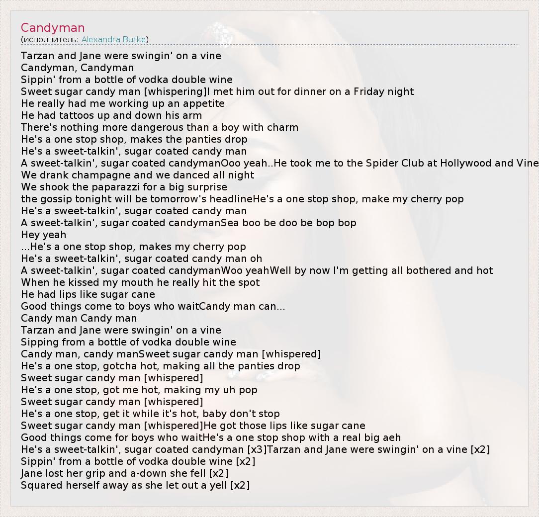He's a sweet-talkin', sugar coated candyman [x3]Tarzan and Jane were swingin' on a vine [x2]