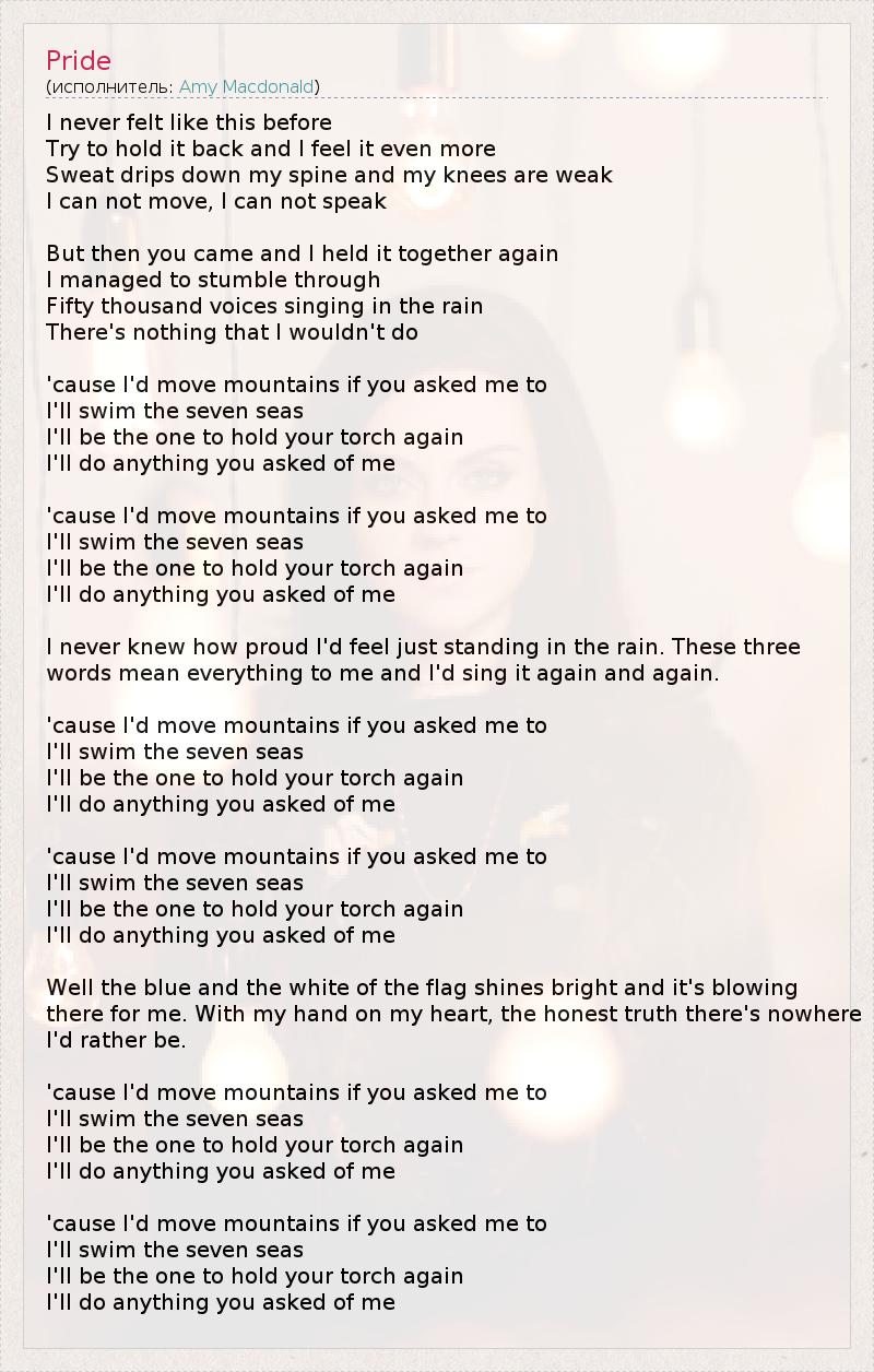 I never felt like this before Try to hold it back and I feel it even more Sweat drips down my spine and my knees are weak I can not move, I can not speak But then you came and I held it together again I managed to stumble through Fifty thousand voices singing in the rain There's nothing that I wouldn't do 'cause I'd move mountains if you asked me to I'll swim the seven seas I'll be the one to hold your torch again I'll do anything you asked of me 'cause I'd move mountains if you asked me to I'll swim the seven seas I'll be the one to hold your torch again I'll do anything you asked of me I never knew how proud I'd feel just standing in the rain. These three words mean everything to me and I'd sing it again and again. 'cause I'd move mountains if you asked me to I'll swim the seven seas I'll be the one to hold your torch again I'll do anything you asked of me 'cause I'd move mountains if you asked me to I'll swim the seven seas I'll be the one to hold your torch again I'll do anything you asked of me Well the blue and the white of the flag shines bright and it's blowing there for me. With my hand on my heart, the honest truth there's nowhere I'd rather be. 'cause I'd move mountains if you asked me to I'll swim the seven seas I'll be the one to hold your torch again I'll do anything you asked of me 'cause I'd move mountains if you asked me to I'll swim the seven seas I'll be the one to hold your torch again I'll do anything you asked of me