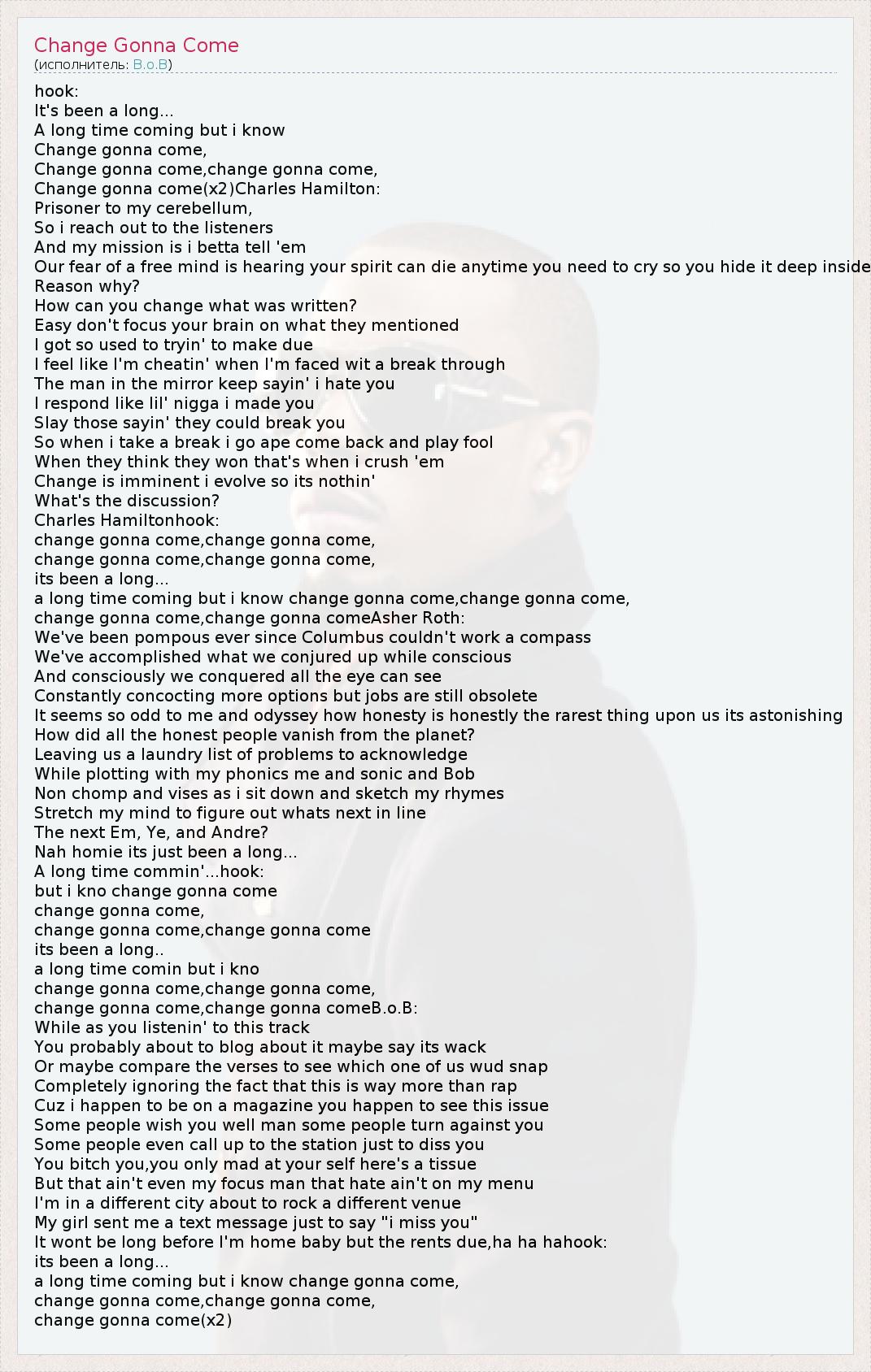 Это интересно:Бобби Рэй Симмонс-младший, Атланта, штат Джорджия (англ. Bobby Ray Simmons, Jr.; 15 ноября 1988, Уинстон-Сейлем, Северная Каролина, США), более известный под псевдонимом B.o.B — американский рэпер, продюсер и гитарист. Его дебютный сингл «Nothin' On You», записанный с Bruno Mars, занял первое место как в Соединённых Штатах, так и в Великобритании, а его второй сингл «... продолжение