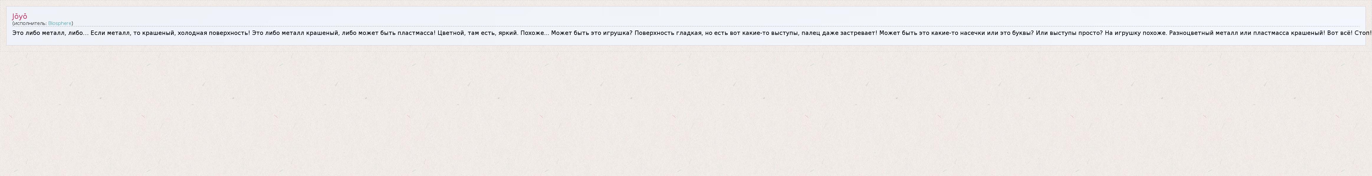 Это либо металл, либо… Если металл, то крашеный, холодная поверхность! Это либо металл крашеный, либо может быть пластмасса! Цветной, там есть, яркий. Похоже... Может быть это игрушка? Поверхность гладкая, но есть вот какие-то выступы, палец даже застревает! Может быть это какие-то насечки или это буквы? Или выступы просто? На игрушку похоже. Разноцветный металл или пластмасса крашеный! Вот всё! Стоп!