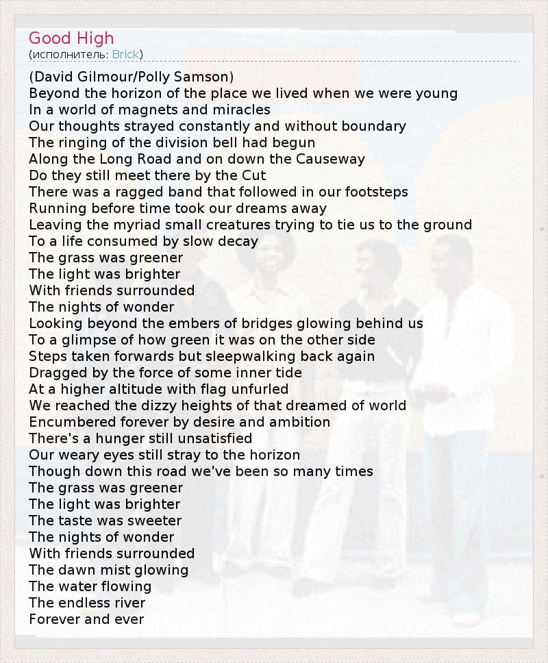 (David Gilmour/Polly Samson) Beyond the horizon of the place we lived when we were young In a world of magnets and miracles Our thoughts strayed constantly and without boundary The ringing of the division bell had begun Along the Long Road and on down the Causeway Do they still meet there by the Cut There was a ragged band that followed in our footsteps Running before time took our dreams away Leaving the myriad small creatures trying to tie us to the ground To a life consumed by slow decay The grass was greener The light was brighter With friends surrounded The nights of wonder Looking beyond the embers of bridges glowing behind us To a glimpse of how green it was on the other side Steps taken forwards but sleepwalking back again Dragged by the force of some inner tide At a higher altitude with flag unfurled We reached the dizzy heights of that dreamed of world Encumbered forever by desire and ambition There's a hunger still unsatisfied Our weary eyes still stray to the horizon Though down this road we've been so many times The grass was greener The light was brighter The taste was sweeter The nights of wonder With friends surrounded The dawn mist glowing The water flowing The endless river Forever and ever