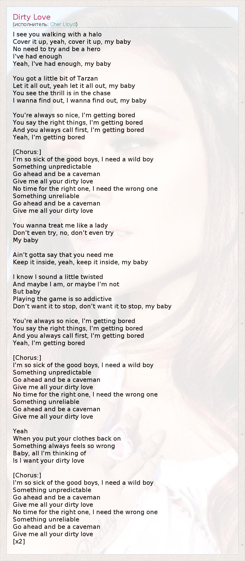I see you walking with a halo Cover it up, yeah, cover it up, my baby No need to try and be a hero I've had enough Yeah, I've had enough, my baby You got a little bit of Tarzan Let it all out, yeah let it all out, my baby You see the thrill is in the chase I wanna find out, I wanna find out, my baby You're always so nice, I'm getting bored You say the right things, I'm getting bored And you always call first, I'm getting bored Yeah, I'm getting bored [Chorus:] I'm so sick of the good boys, I need a wild boy Something unpredictable Go ahead and be a caveman Give me all your dirty love No time for the right one, I need the wrong one Something unreliable Go ahead and be a caveman Give me all your dirty love You wanna treat me like a lady Don't even try, no, don't even try My baby Ain't gotta say that you need me Keep it inside, yeah, keep it inside, my baby I know I sound a little twisted And maybe I am, or maybe I'm not But baby Playing the game is so addictive Don't want it to stop, don't want it to stop, my baby You're always so nice, I'm getting bored You say the right things, I'm getting bored And you always call first, I'm getting bored Yeah, I'm getting bored [Chorus:] I'm so sick of the good boys, I need a wild boy Something unpredictable Go ahead and be a caveman Give me all your dirty love No time for the right one, I need the wrong one Something unreliable Go ahead and be a caveman Give me all your dirty love Yeah When you put your clothes back on Something always feels so wrong Baby, all I'm thinking of Is I want your dirty love [Chorus:] I'm so sick of the good boys, I need a wild boy Something unpredictable Go ahead and be a caveman Give me all your dirty love No time for the right one, I need the wrong one Something unreliable Go ahead and be a caveman Give me all your dirty love [x2]