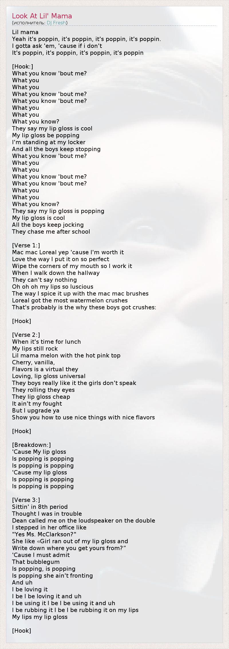 Lil mama Yeah it's poppin, it's poppin, it's poppin, it's poppin. I gotta ask 'em, 'cause if i don't It's poppin, it's poppin, it's poppin, it's poppin [Hook:] What you know 'bout me? What you What you What you know 'bout me? What you know 'bout me? What you What you What you know? They say my lip gloss is cool My lip gloss be popping I'm standing at my locker And all the boys keep stopping What you know 'bout me? What you What you What you know 'bout me? What you know 'bout me? What you What you What you know? They say my lip gloss is popping My lip gloss is cool All the boys keep jocking They chase me after school [Verse 1:] Mac mac Lorеal yep 'cause I'm worth it Love the way I put it on so perfect Wipe the corners of my mouth so I work it When I walk down the hallway They can't say nothing Oh oh oh my lips so luscious The way I spice it up with the mac mac brushes Loreal got the most watermelon crushes That's probably is the why these boys got crushes: [Hook] [Verse 2:] When it's time for lunch My lips still rock Lil mama melon with the hot pink top Cherry, vanilla, Flavors is a virtual they Loving, lip gloss universal They boys really like it the girls don't speak They rolling they eyes They lip gloss cheap It ain't my fought But I upgrade ya Show you how to use nice things with nice flavors [Hook] [Breakdown:] 'Cause My lip gloss Is popping is popping Is popping is popping 'Cause my lip gloss Is popping is popping Is popping is popping [Verse 3:] Sittin' in 8th period Thought I was in trouble Dean called me on the loudspeaker on the double I stepped in her office like "Yes Ms. McClarkson?" She like «Girl ran out of my lip gloss and Write down where you get yours from?” 'Cause I must admit That bubblegum Is popping, is popping Is popping she ain't fronting And uh I be loving it I be I be loving it and uh I be using it I be I be using it and uh I be rubbing it I be I be rubbing it on my lips My lips my lip gloss [Hook]