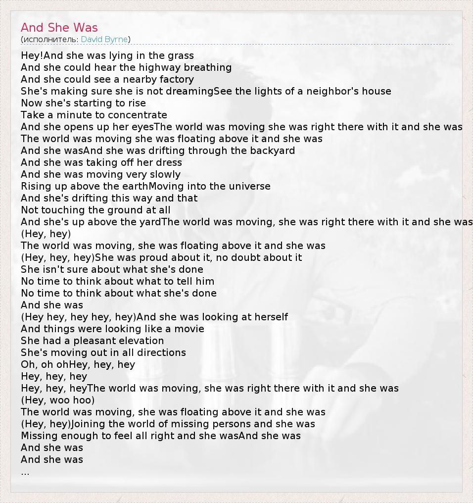 Hey, hey, heyThe world was moving, she was right there with it and she was