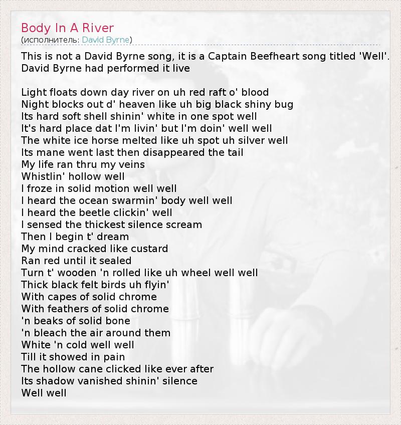 This is not a David Byrne song, it is a Captain Beefheart song titled 'Well'. David Byrne had performed it live Light floats down day river on uh red raft o' blood Night blocks out d' heaven like uh big black shiny bug Its hard soft shell shinin' white in one spot well It's hard place dat I'm livin' but I'm doin' well well The white ice horse melted like uh spot uh silver well Its mane went last then disappeared the tail My life ran thru my veins Whistlin' hollow well I froze in solid motion well well I heard the ocean swarmin' body well well I heard the beetle clickin' well I sensed the thickest silence scream Then I begin t' dream My mind cracked like custard Ran red until it sealed Turn t' wooden 'n rolled like uh wheel well well Thick black felt birds uh flyin' With capes of solid chrome With feathers of solid chrome 'n beaks of solid bone 'n bleach the air around them White 'n cold well well Till it showed in pain The hollow cane clicked like ever after Its shadow vanished shinin' silence Well well