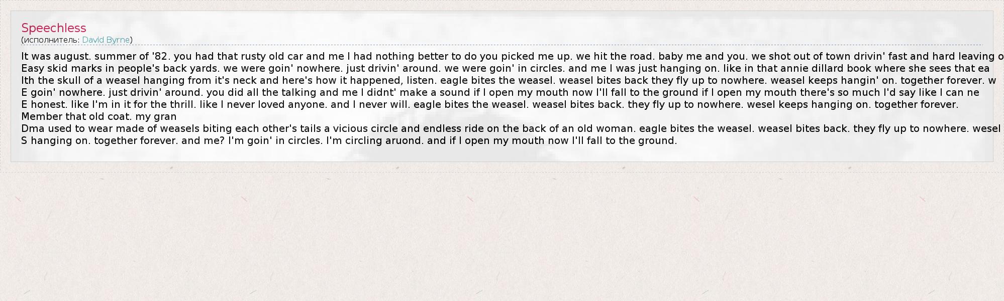 Ith the skull of a weasel hanging from it's neck and here's how it happened, listen. eagle bites the weasel. weasel bites back they fly up to nowhere. weasel keeps hangin' on. together forever. w